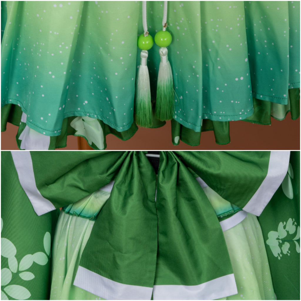 The AwwwCos 2 Kinds Anime Love Live Kosaka Honoka Koizumi Hanayo Cosplay Costume is a beautifully crafted outfit inspired by the characters from Love Live. The costume features a traditional Japanese kimono-style top with elegant bell sleeves and a short pleated skirt, both adorned with exquisite floral prints. The wide waistband accentuates the figure, adding a flattering touch. Accessories include a cute bow tie, and the costume is available in two colors: orange and green, allowing you to choose the perfect match for your cosplay. This outfit captures the charm and grace of the characters, making it ideal for anime fans.