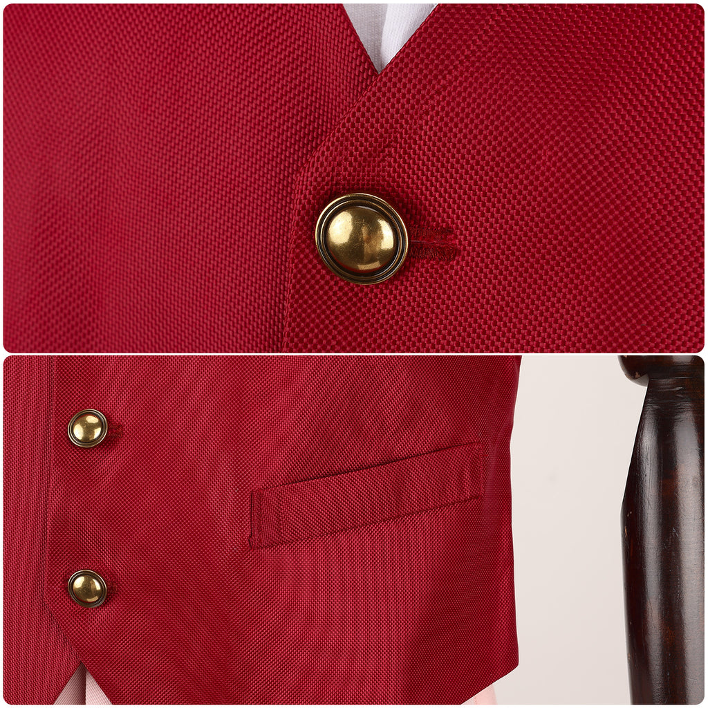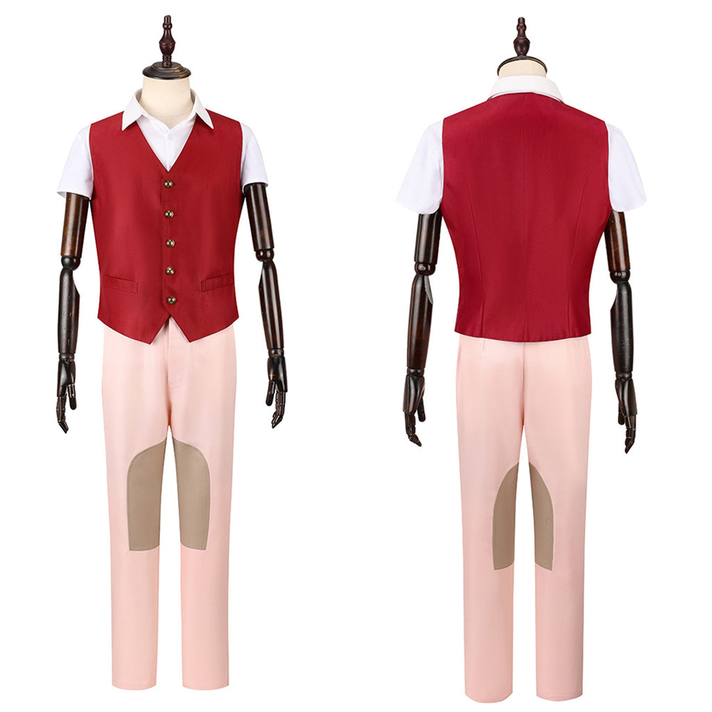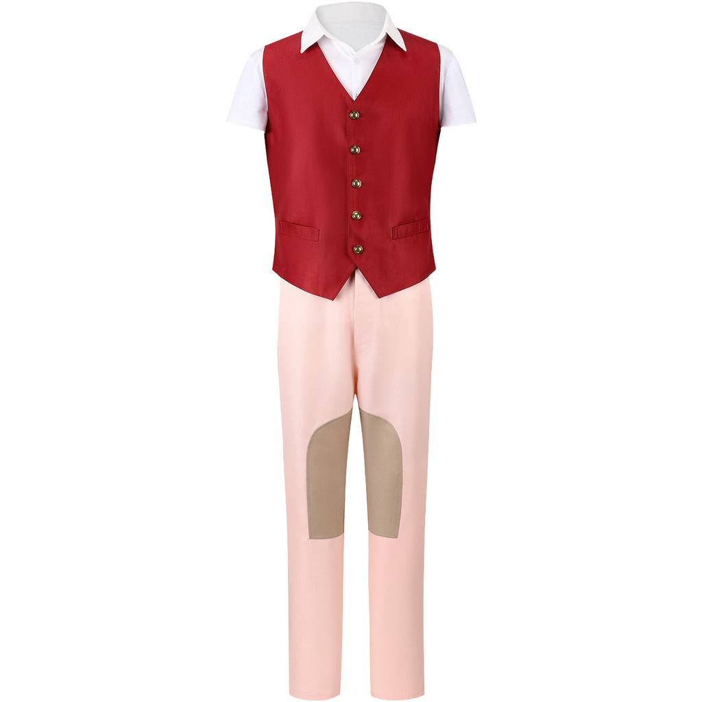 The AwwwCos 3 Pieces Men Movie Wicked Fiyero Boq Cosplay Costume features a stylish and unique design inspired by the characters Fiyero and Boq from Wicked. The outfit includes a sleeveless, loose-fitting red vest with a single-breasted button closure, paired with a white short-sleeve shirt underneath for a clean and sharp look. The pink pants are enhanced with light brown patches on the knees, adding a playful touch to the ensemble. This versatile costume is not only perfect for cosplay events but also a great choice for casual daily wear, effortlessly combining comfort and style while capturing the essence of the characters.