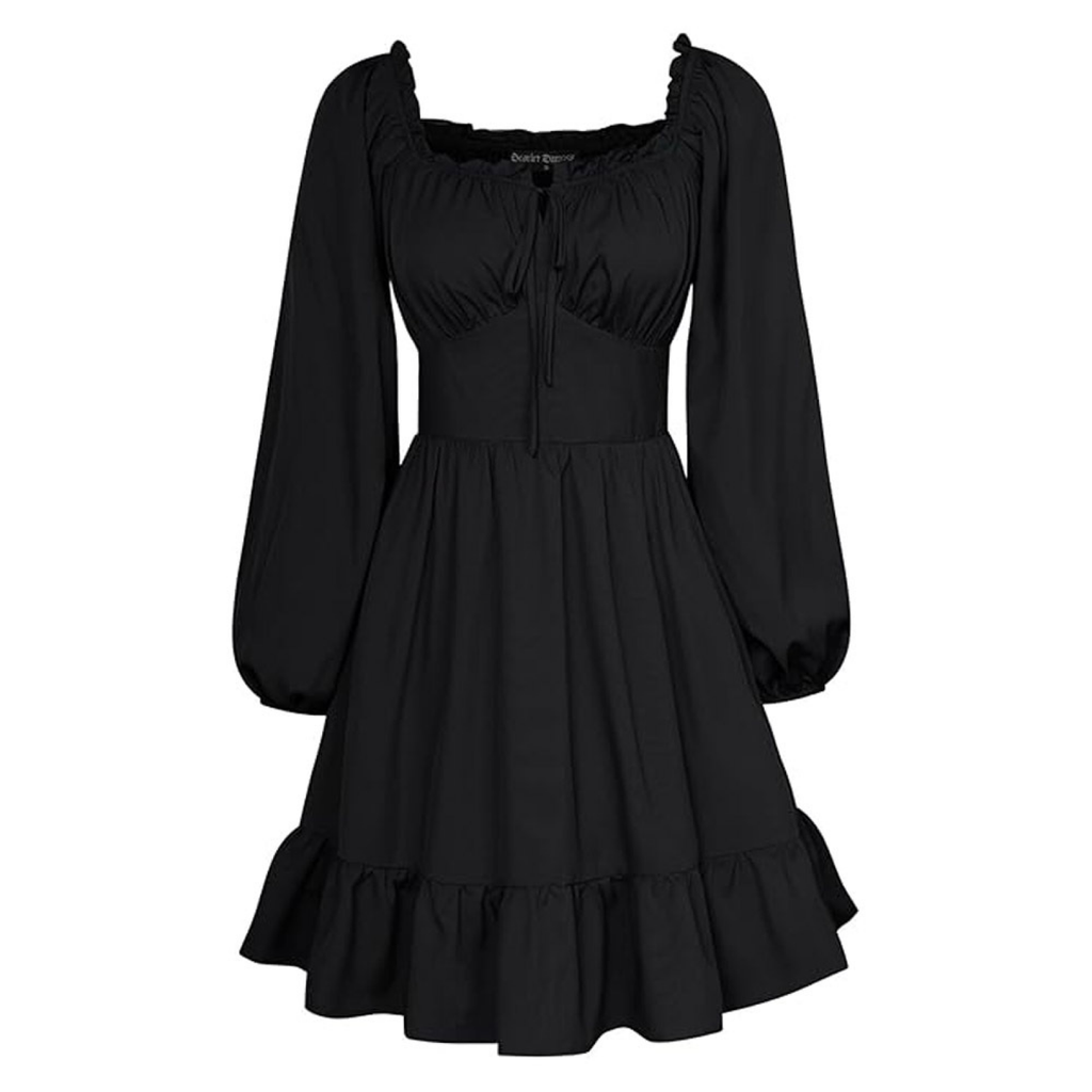 The AwwwCos 6 Kinds Renaissance Victorian Belted Ruffled Square Neck Midi Dress is a charming and versatile costume perfect for Halloween or Renaissance-themed events. The dress features long sleeves and a square neckline, with an elasticized collar that can be worn off the shoulder for a more dramatic effect. The belted waist adds a flattering touch, while the ruffled details provide a vintage flair. Available in six beautiful colors—black, teal, white, green, red, and ivory—this dress combines elegance with a touch of history, making it an excellent choice for anyone seeking a timeless, romantic look.