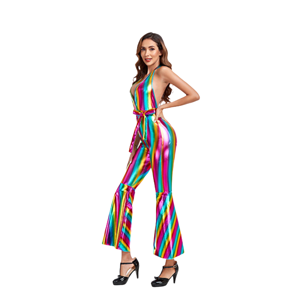 The AwwwCos 7 Kinds Disco Show Cosplay Halloween 60-70s Retro Prom Hip Hop Stage Costume offers seven vibrant and stylish outfits inspired by the disco era. The collection includes shiny faux leather backless jumpsuits, V-neck long-sleeve sheer mini skirts, sleeveless bodysuits, and headbands, all designed to capture the essence of 60s-70s retro fashion. Each outfit is bold and eye-catching, perfect for making a statement at Halloween parties, stage performances, or any retro-themed event. With seven different styles to choose from, this costume set offers plenty of options for those looking to channel the funky, glamorous vibe of the disco age.