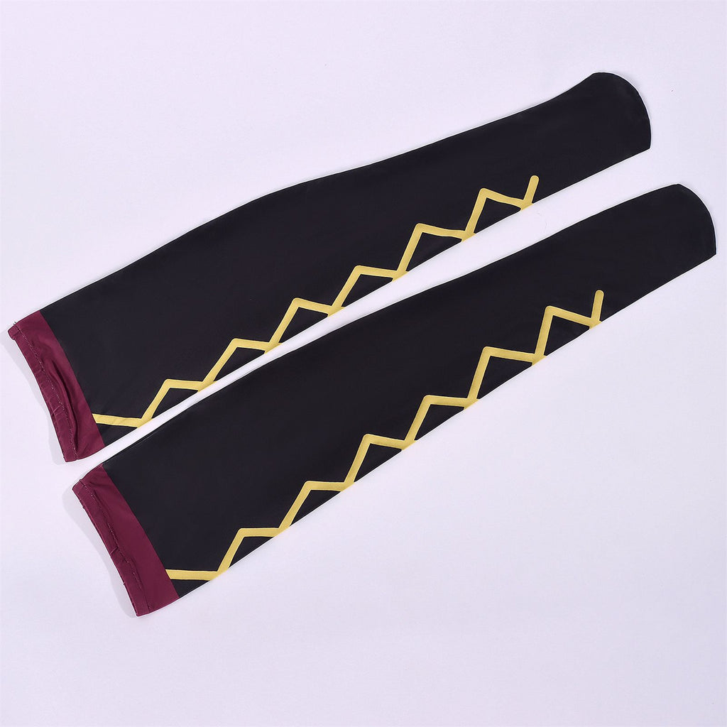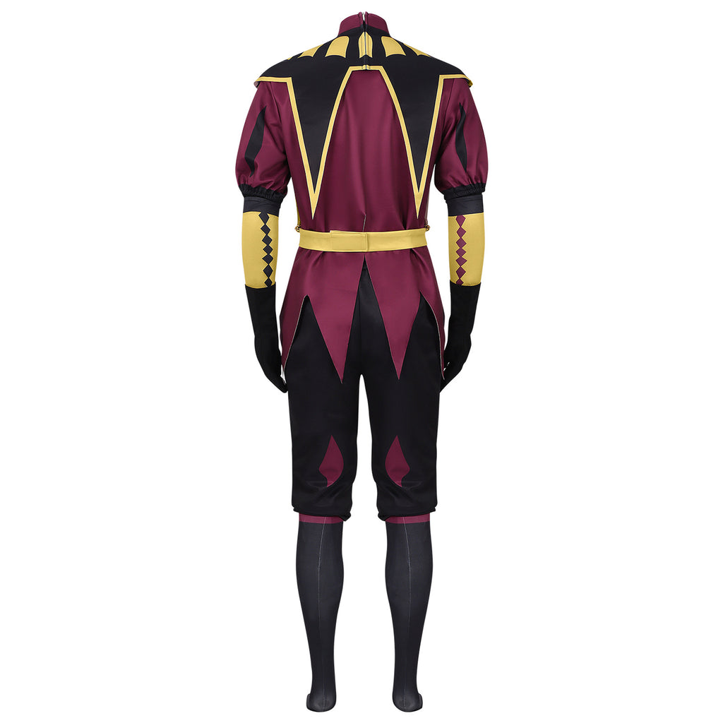 The AwwwCos Adult Men The Freak Circus Pierrot Cosplay Costume Burgundy Red Outfits captures the dramatic and whimsical spirit of the Pierrot character from circus performances. The ensemble includes a burgundy red top layered over a black undergarment and matching trousers, offering a striking contrast. The hat is designed with a unique horn-like shape, adding an eccentric touch to the look. The mask features a smile expression, completing the character's playful persona. Accessories like a shawl, gloves, ticket, socks, sleeves, and a belt add the final touches, ensuring an authentic and immersive cosplay experience. This costume is perfect for anyone looking to embody the quirky and theatrical Pierrot character at cosplay events or performances.