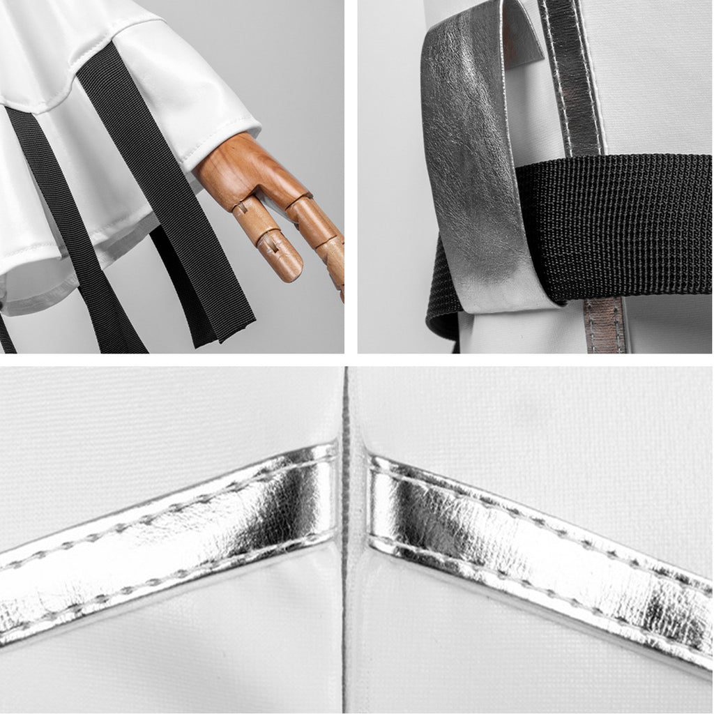 The AwwwCos Anime Code Geass Lelouch of the Rebellion C.C. Cosplay White Jumpsuit is a stylish and detailed costume perfect for fans of Code Geass. This white long-sleeve jumpsuit features bell-shaped sleeves and flared pants, giving it a dramatic and unique look. The outfit comes with accessories including a black shoulder strap, leg belt, necklace, and white socks, all designed to capture C.C.'s iconic appearance. This cosplay suit is ideal for anime conventions, Halloween, or any Code Geass themed event, allowing you to bring the mysterious and powerful C.C. to life!
