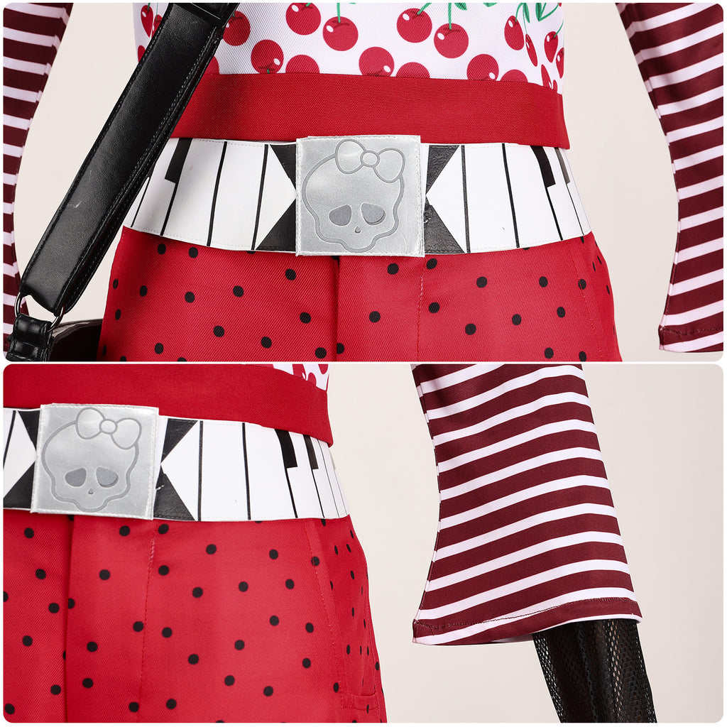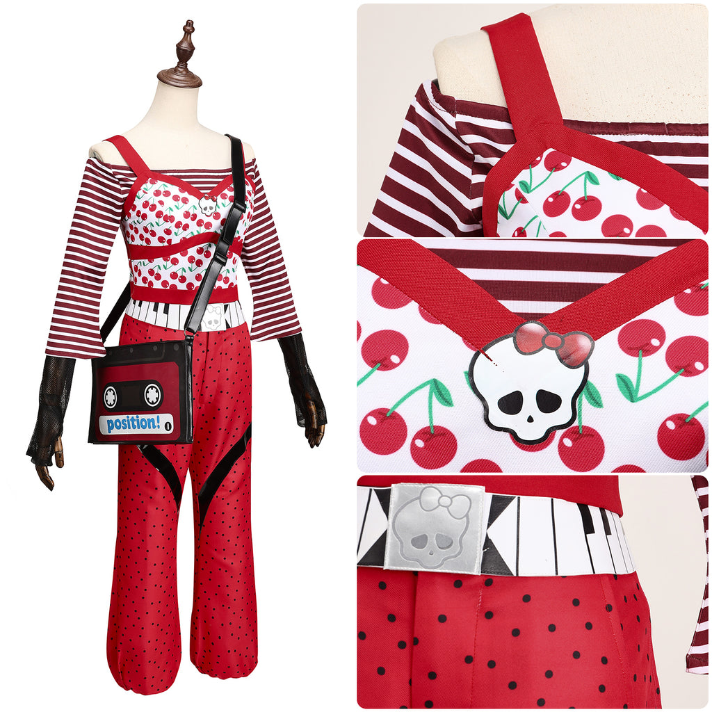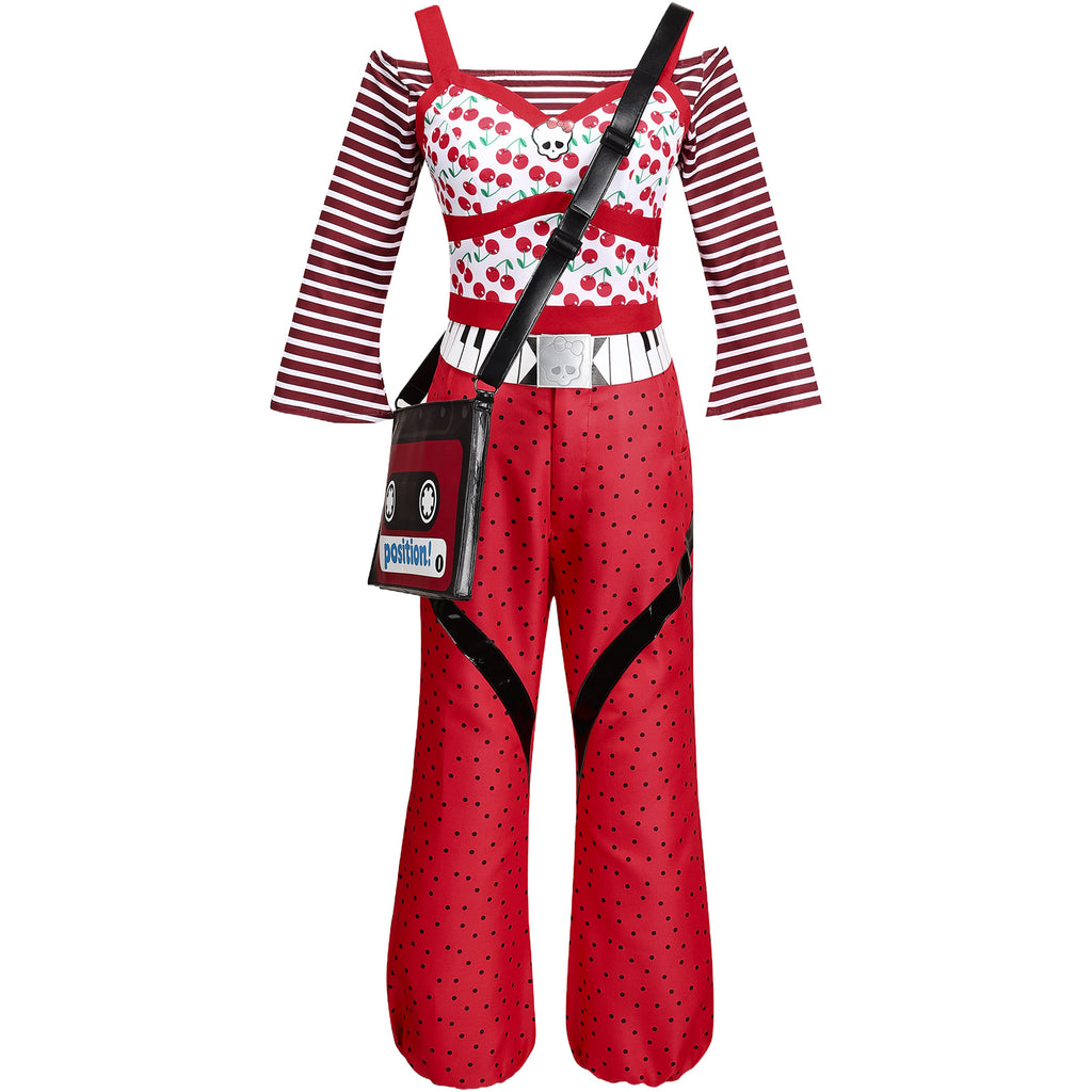 The AwwwCos Anime Monster High Ghoulia Yelps Cosplay Costume is a fun and vibrant outfit inspired by the character Ghoulia Yelps from Monster High. It includes a cherry and skull print tank top layered over a red and white striped long-sleeve shirt. The black polka dot red pants are loose and comfortable, perfect for cosplay events or casual wear. The costume is accessorized with a belt, gloves, a green headband, and a crossbody bag featuring a cassette tape pattern, completing the quirky and stylish look. This outfit perfectly captures Ghoulia Yelps' unique and playful style.