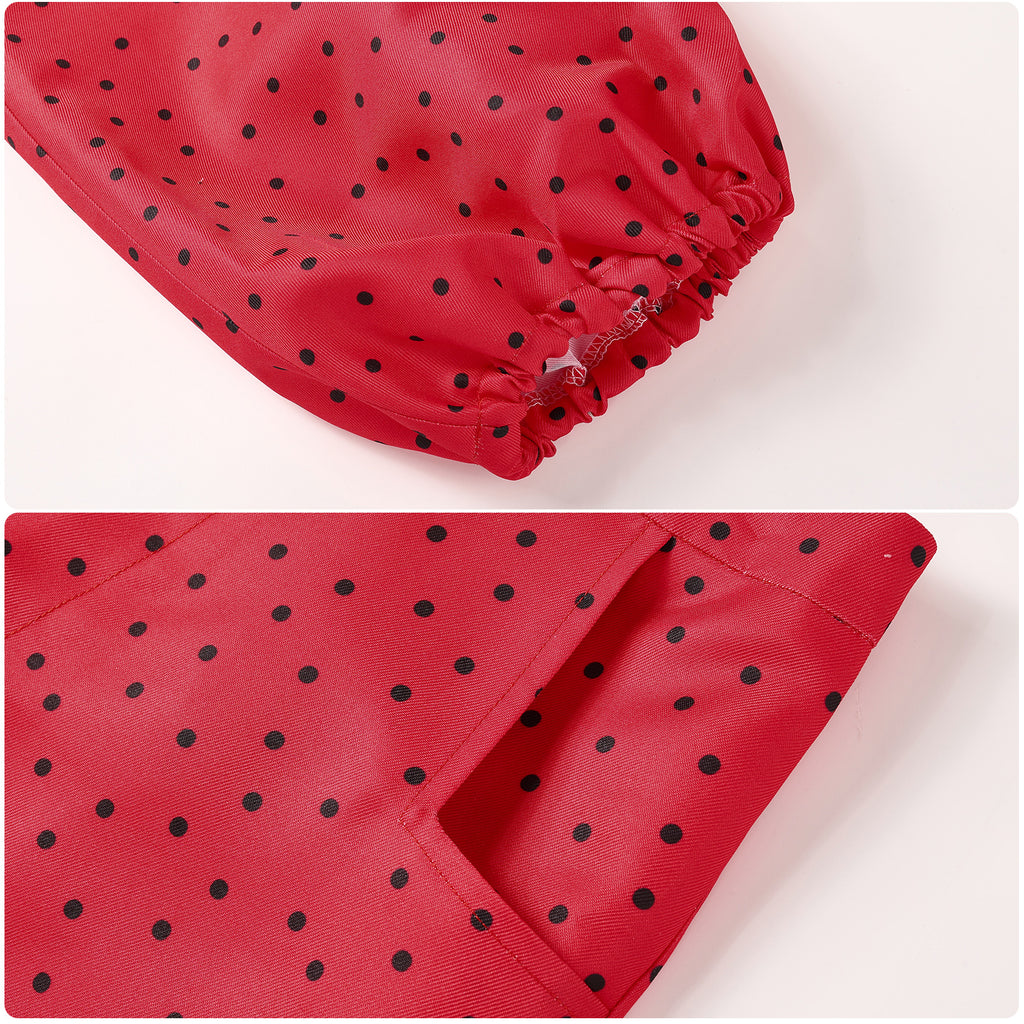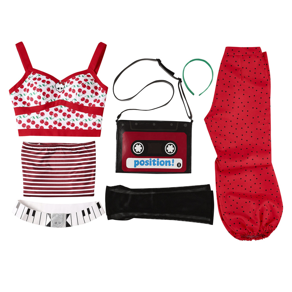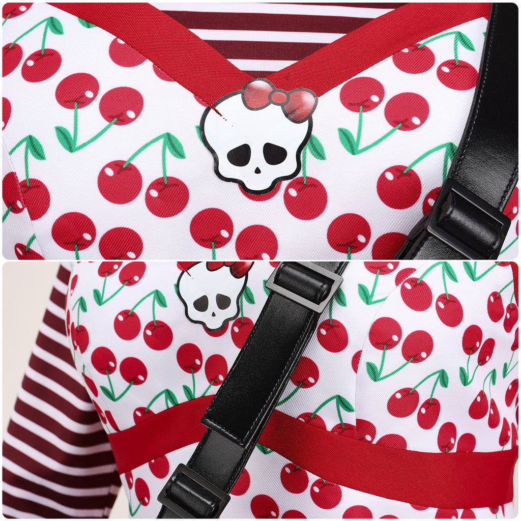 The AwwwCos Anime Monster High Ghoulia Yelps Cosplay Costume is a fun and vibrant outfit inspired by the character Ghoulia Yelps from Monster High. It includes a cherry and skull print tank top layered over a red and white striped long-sleeve shirt. The black polka dot red pants are loose and comfortable, perfect for cosplay events or casual wear. The costume is accessorized with a belt, gloves, a green headband, and a crossbody bag featuring a cassette tape pattern, completing the quirky and stylish look. This outfit perfectly captures Ghoulia Yelps' unique and playful style.