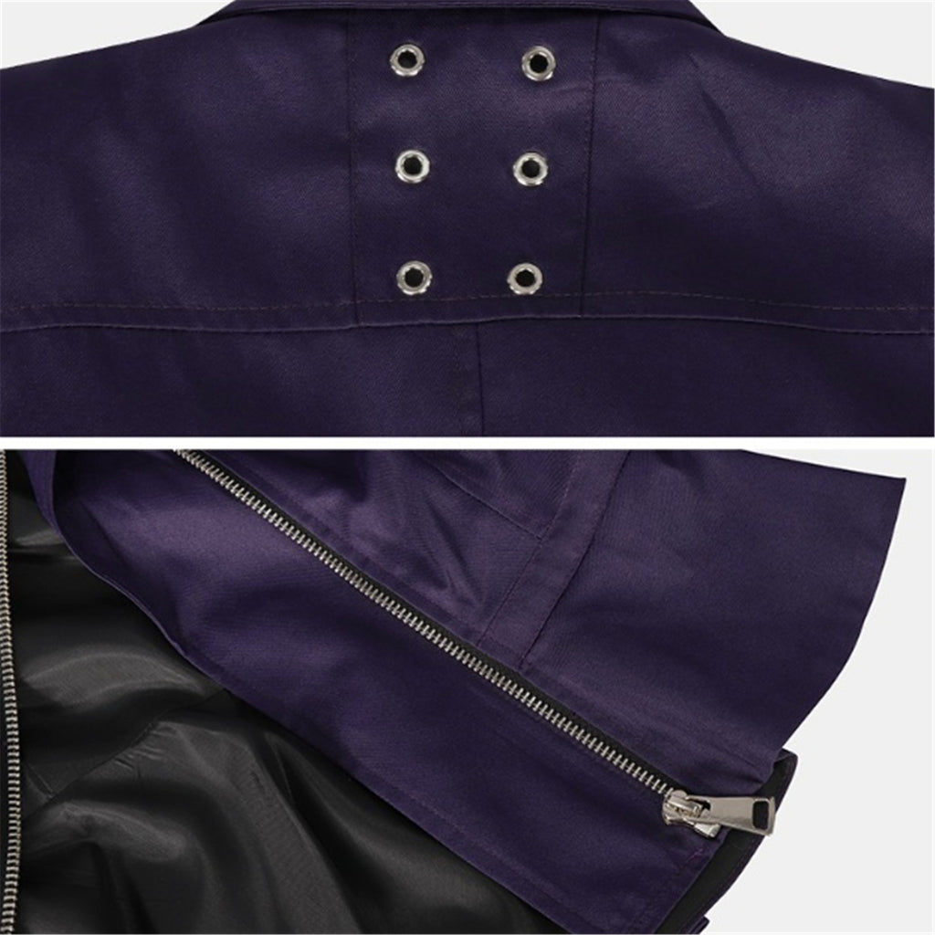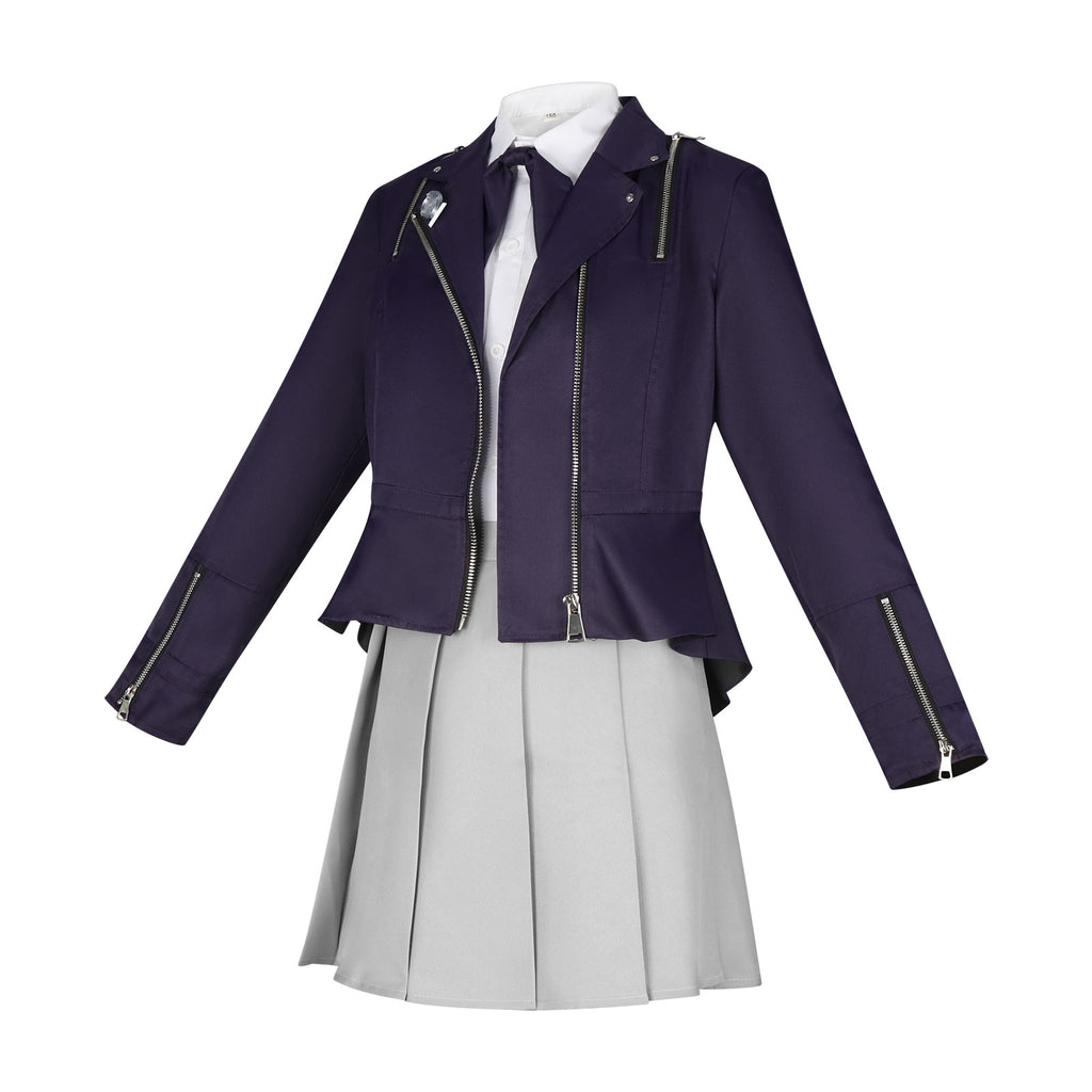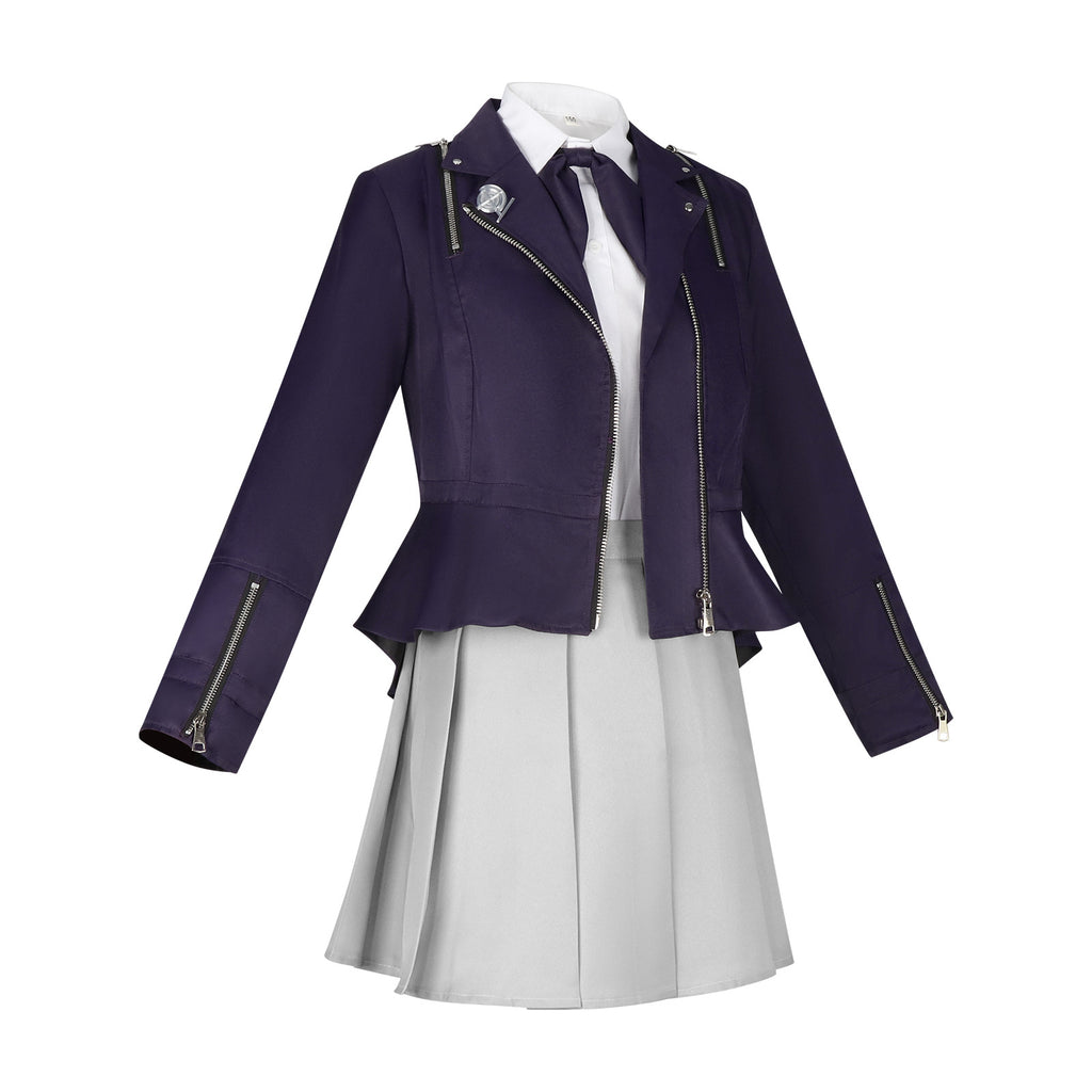 The AwwwCos Anime The Hundred Line Last Defense Academy Nozomi Kirifuji Cosplay Costume is a stylish and detailed outfit inspired by the anime character Nozomi Kirifuji. The costume features a loose-fitting, long-sleeve purple zip-up coat paired with a crisp white shirt and a light grey pleated skirt. It’s accessorized with a neckpiece, a headwear with a cute bow decoration, and a matching tie, adding elegance to the look. For a complete transformation, optional accessories such as a long white wig and grey shoes are available. This cosplay outfit captures Nozomi’s essence perfectly, making it a great choice for anime fans and cosplay enthusiasts.