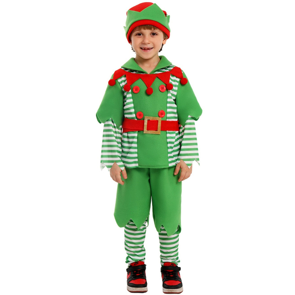 Style B (Boys): Includes a green hat, top, and pants, striped leg covers, and a red belt for a playful and festive elf outfit.