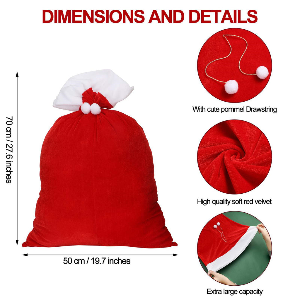 The AwwwCos Christmas Large Sack Santa Claus Cosplay Prop Xmas Candy Wrapping Bag for Present is a classic holiday accessory perfect for Christmas celebrations. Made from soft velvet material, this red bag features a fluffy white plush cuff and two pom-pom at the top, adding a festive and cozy touch. 2 kinds rectangle shaped bag is ideal for hanging on the Christmas tree to hold gifts, creating a magical surprise for children. Its charming design makes it a great addition to your holiday decorations, bringing joy and excitement to your Christmas festivities.