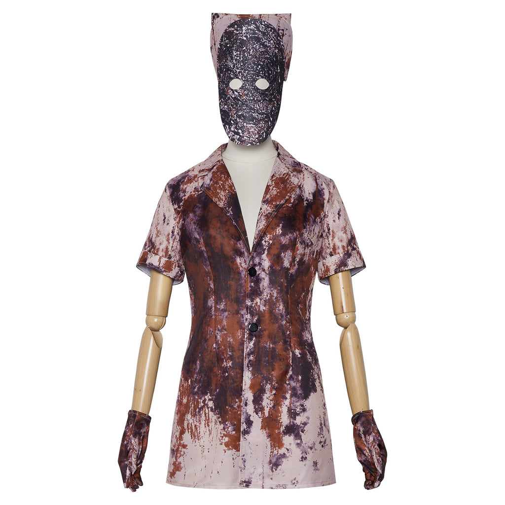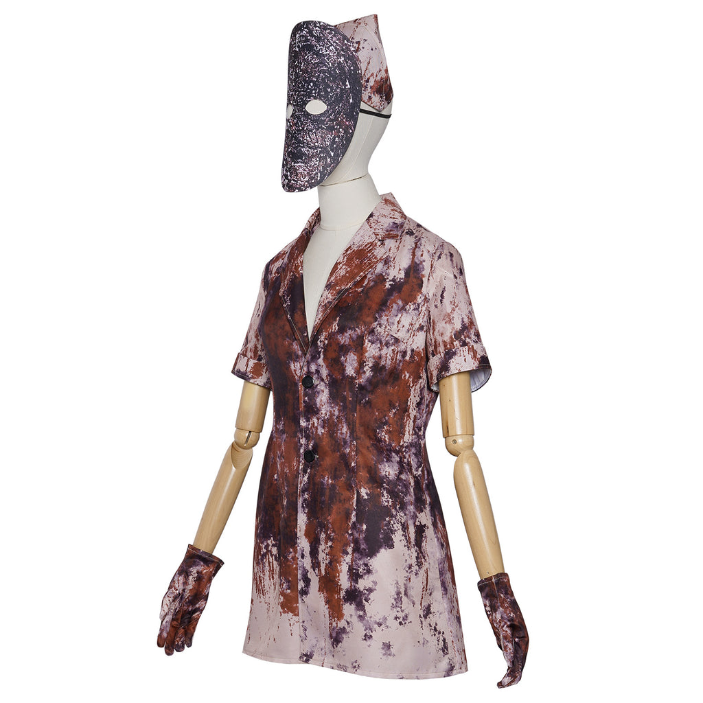 The AwwwCos Game Silent Hill Nures Cosplay Costume Mini Dress Mask Gloves for Women includes a haunting dress and mask inspired by the terrifying character from the game. The dress features a distressed, tattered design that captures the eerie essence of the Butcher Ghost, evoking a sense of horror and mystery. Accompanied by a matching mask, this costume enhances the chilling aesthetic, allowing wearers to fully embrace the character's unsettling presence. Made from high-quality materials, it ensures comfort while maintaining an authentic look. Perfect for Halloween events, cosplay gatherings, or themed parties, this costume is sure to leave a lasting impression on fellow fans of Silent Hill.