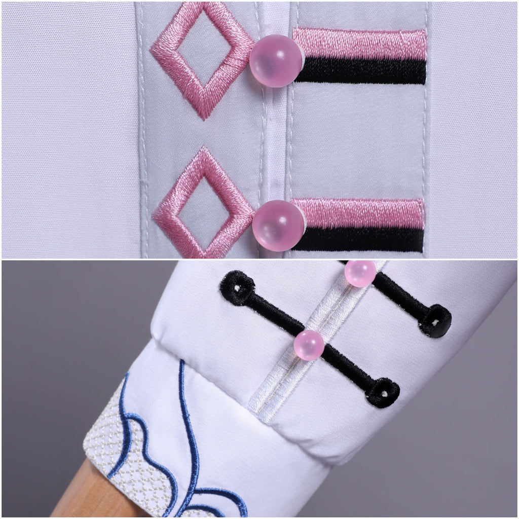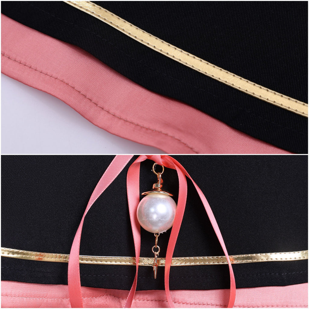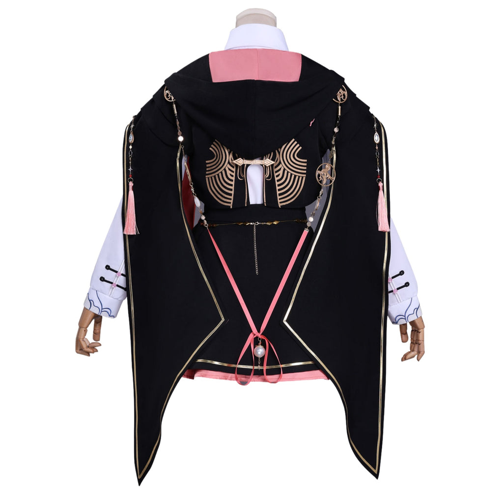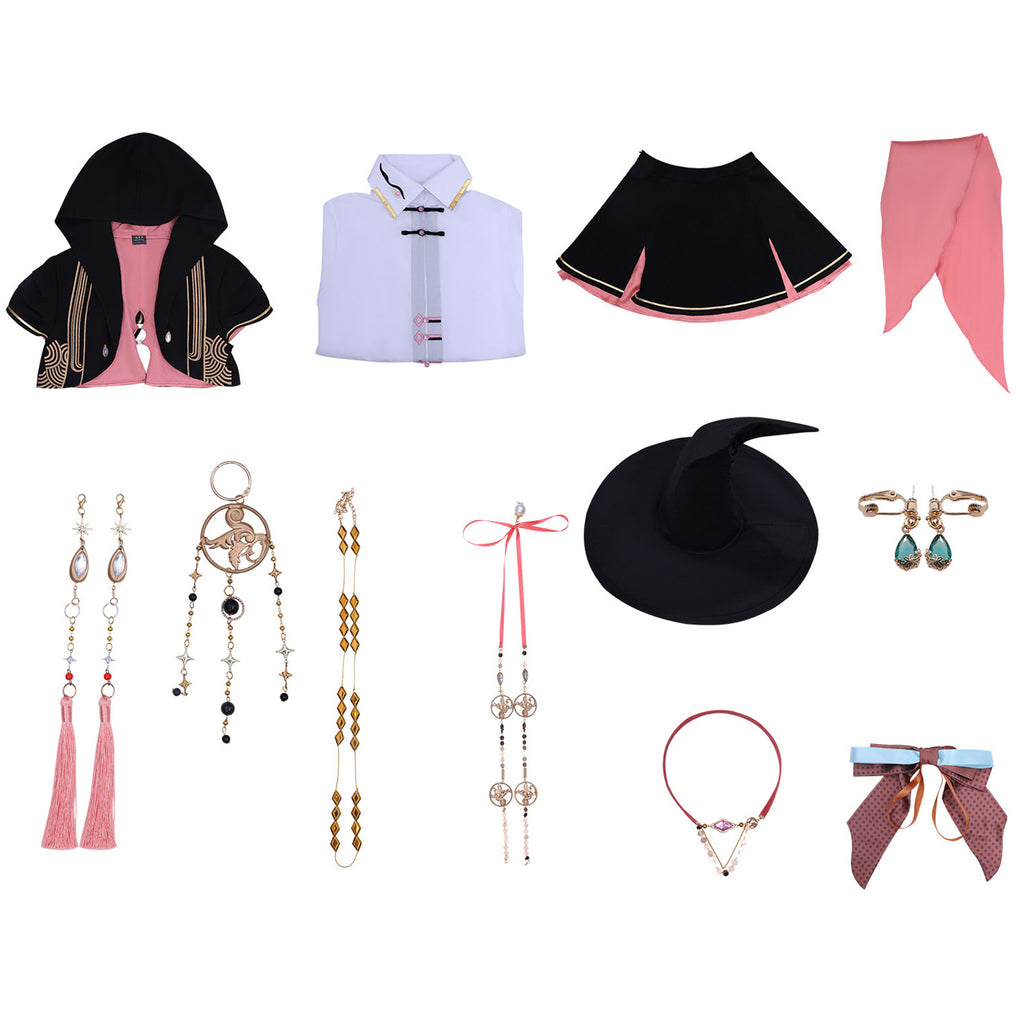 The AwwwCos Female Game Tears of Themis Miss Lawyer: Heartbeat Curse Cosplay Costume is a stunning and detailed outfit inspired by the game Tears of Themis. This costume features a black hooded coat layered over a long-sleeve white shirt and a black knee-length skirt, creating a sophisticated and mysterious look. The accessories include a back decoration, hat decoration, headwear, shoulder straps, earrings, chest and shoulder accessories, and a waist chain, adding to the character’s elegance. The black pointed hat, adorned with cute artificial pearls and pink ribbons, along with other Lolita-style elements, completes the outfit with a charming and whimsical flair. This cosplay costume is perfect for fans of Tears of Themis and those looking to embody the Miss Lawyer character in a stylish and playful way.