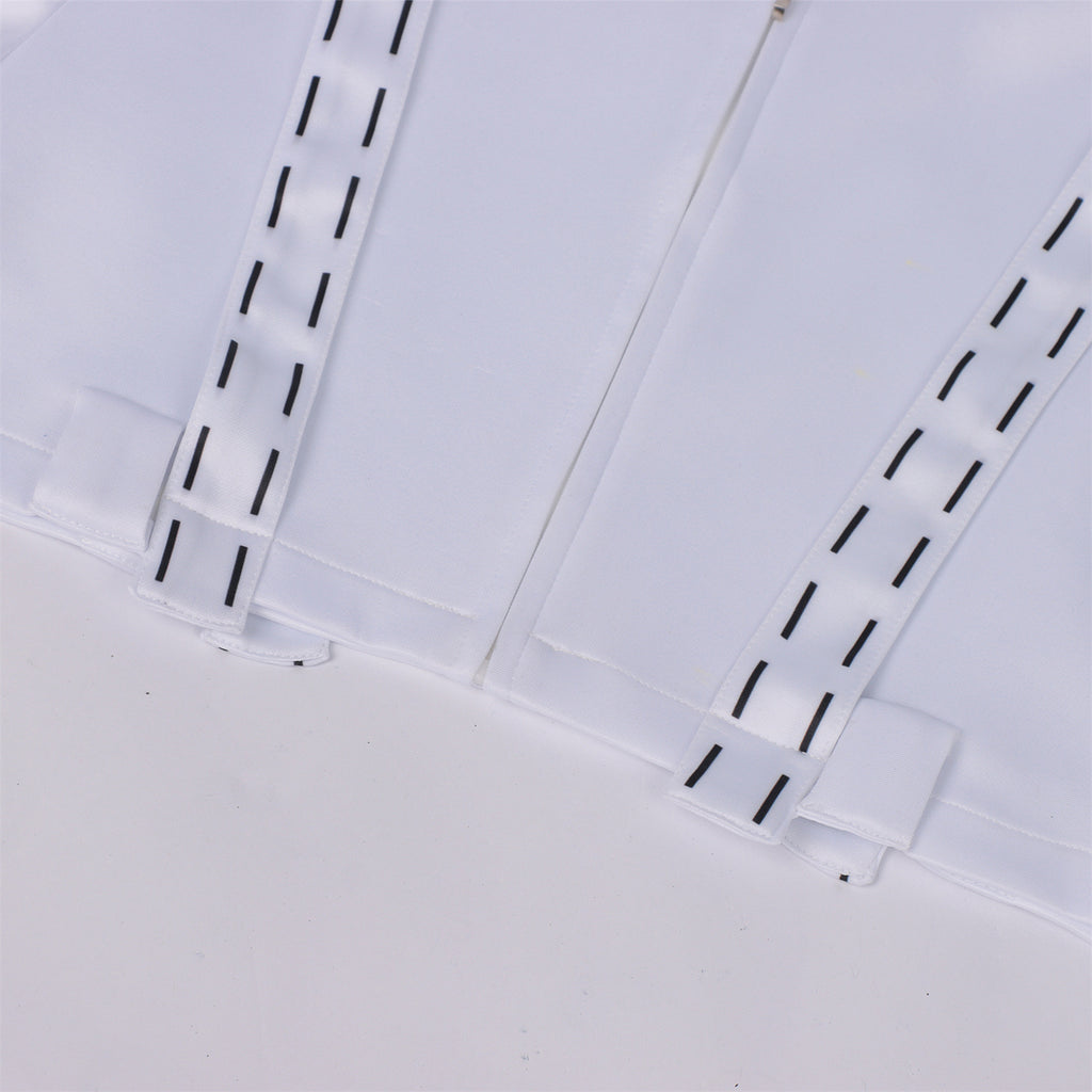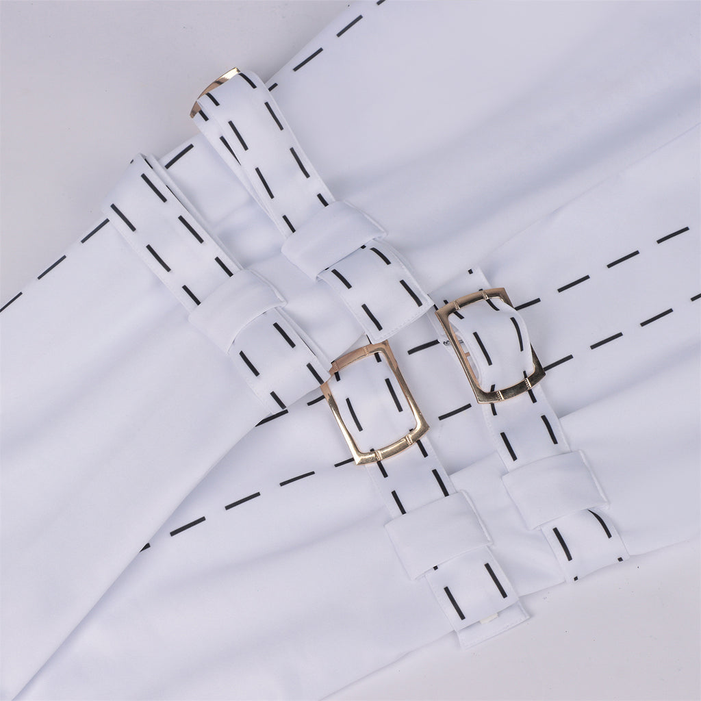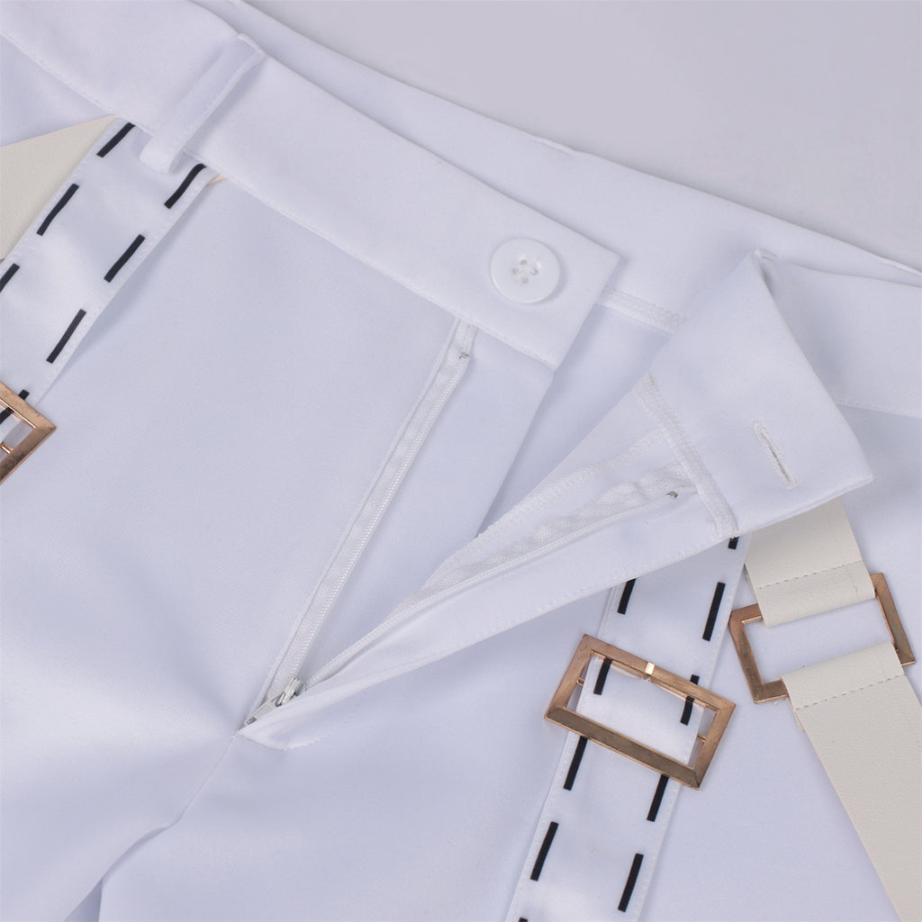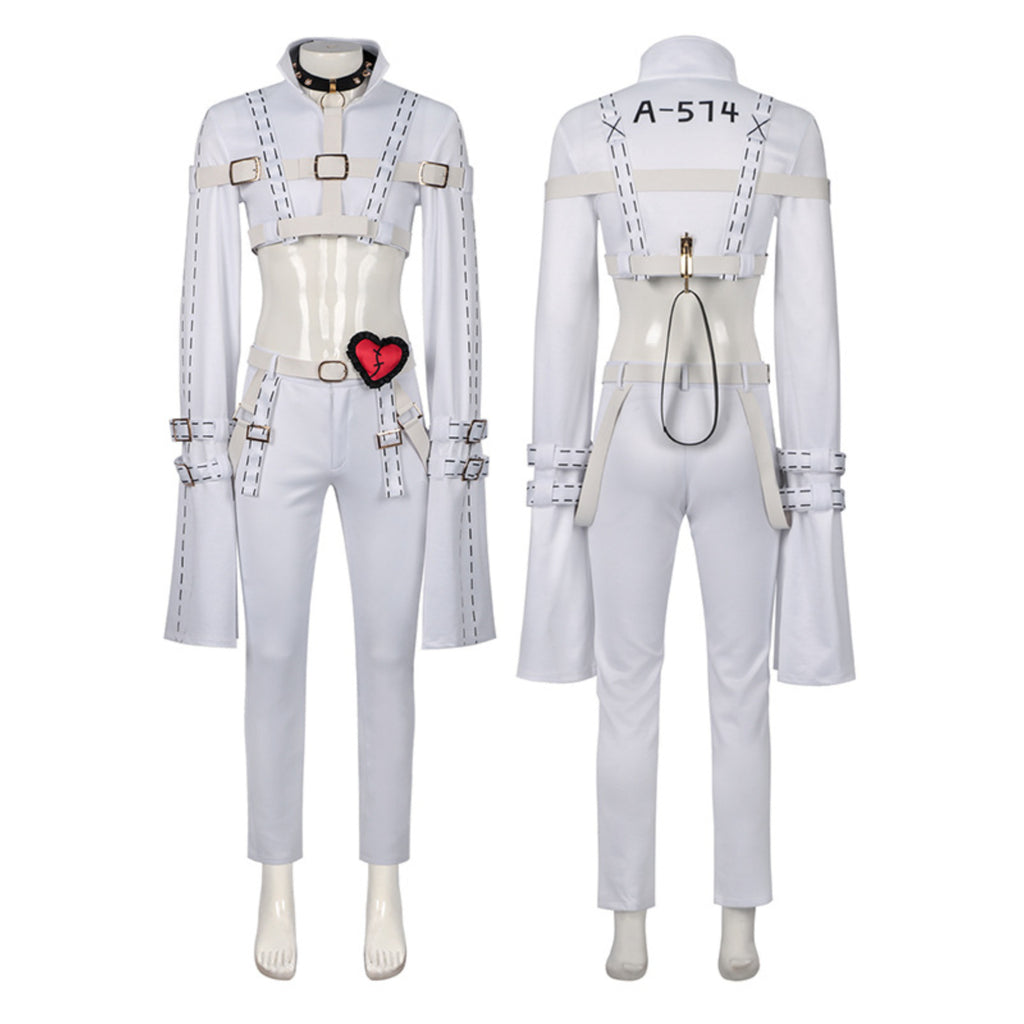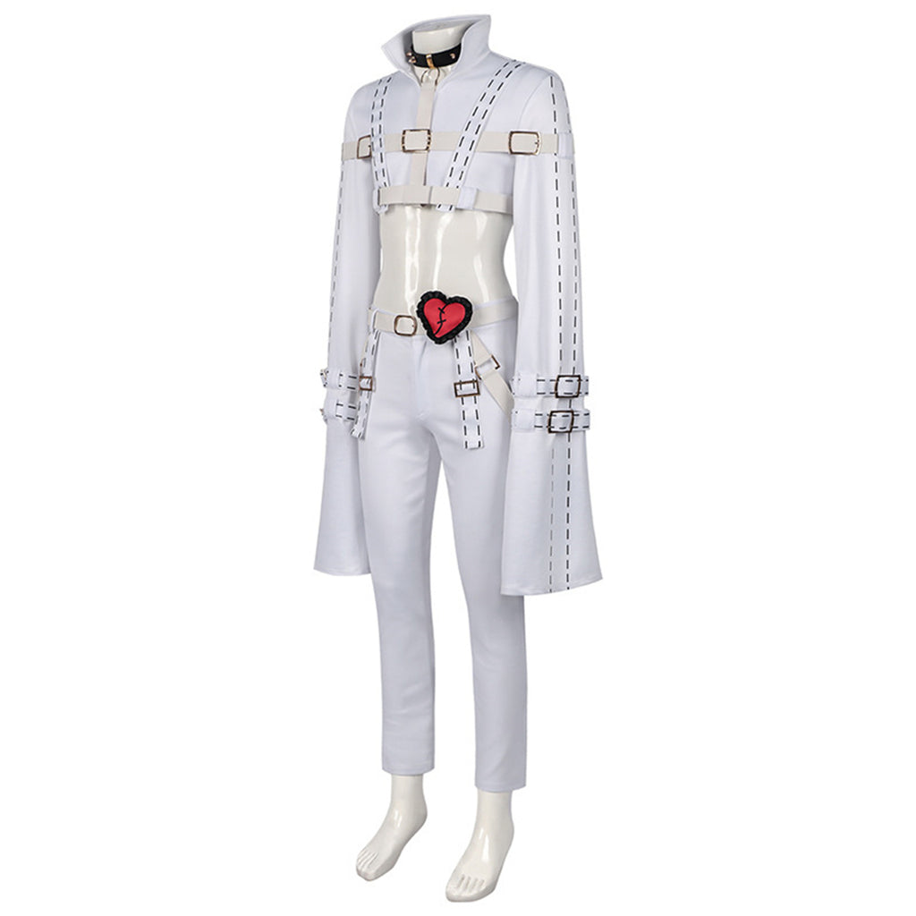 The AwwwCos Eggy Party Raymond the Caged Beast Cosplay Costume features a mini blouse with long sleeves, faithfully recreating the character's appearance. The matching white pants and cuffs complete the outfit, while the red sweetheart-shaped waist decoration adds a fun and cute touch. The costume is accessorized with a belt set, mask, collar, and back decoration, ensuring that every detail of Raymond's look is captured. This full ensemble is perfect for fans of Eggy Party who want to embody Raymond the Caged Beast with both accuracy and charm at cosplay events or themed gatherings.