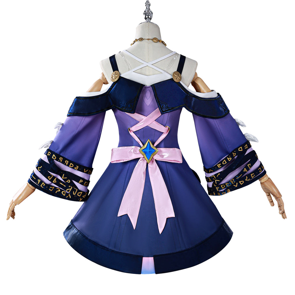 The AwwwCos Game Honkai: Star Rail Cyrene Cosplay Costume is a beautifully detailed outfit that captures the essence of Cyrene's character. The costume features a purple bell-sleeve, knee-length dress, layered over a white embroidered vest, creating an elegant and dynamic look. Accessories include a belt, headwear, neck ornament, clothes ornament, and a back ornament, adding intricate details to the ensemble. For an added touch, there are white and gold bandage sandals and a pink wig available for purchase to complete the look. Perfect for fans of Honkai: Star Rail looking to cosplay Cyrene with style and authenticity!