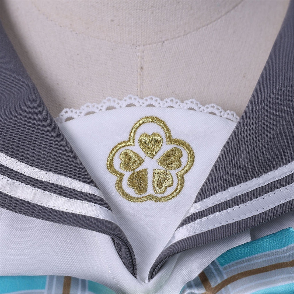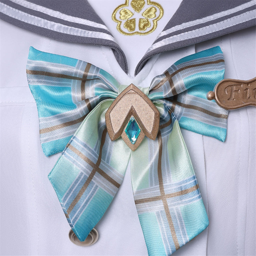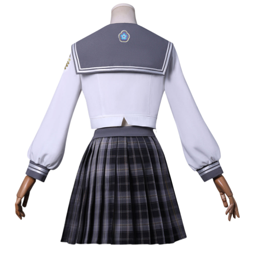 The AwwwCos Game Honkai: Star Rail Firefly Springtime Gift Cosplay Costume Sailor Suits is a beautifully detailed outfit inspired by the game Honkai: Star Rail. The costume features a white long-sleeve top paired with a gray knee-length pleated skirt, both adorned with exquisite gold plum blossom embroidery at the collar and sleeves. Accessories include a green checkered bow and gold accents at the collar, as well as a gray headwear and white socks with matching gold plum blossom designs. available wig for choose.This cosplay outfit perfectly captures the character's elegant and playful look, making it ideal for both cosplay events and stylish everyday wear.