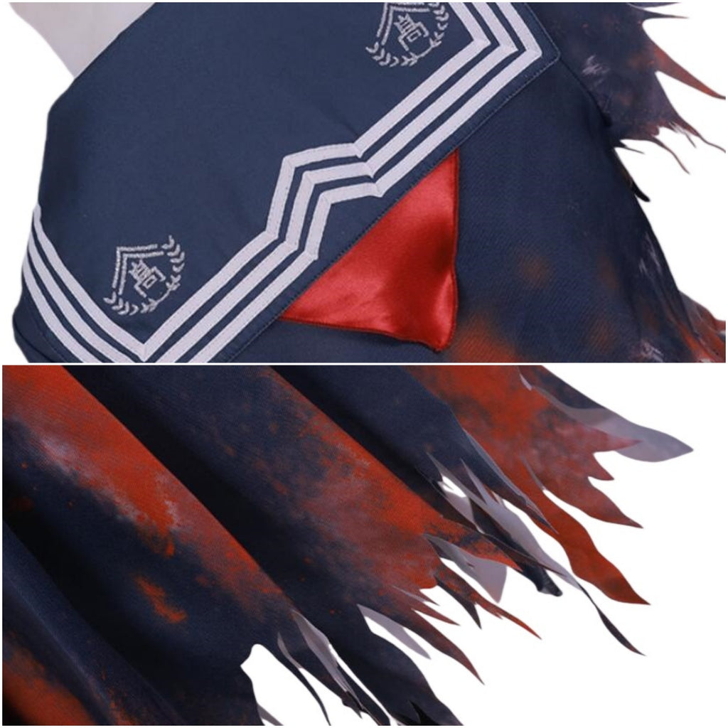 The AwwwCos Game Silent Hill Shimizu Hinako Cosplay Costume Bloodstained Sailor Suit is a haunting and eerie outfit inspired by the Silent Hill series, perfect for creating a chilling Halloween look. The sailor suit is made from dark blue fabric stained with blood, adding to its unsettling atmosphere. The right sleeve appears violently torn, while the skirt is uneven and looks as though it's been ripped, enhancing the distressed and horror-filled aesthetic. The costume is completed with a red bow tie, giving it an extra touch of eerie detail. Ideal for fans of Silent Hill or anyone looking to embrace a terrifying, blood-soaked look for Halloween or cosplay events.
