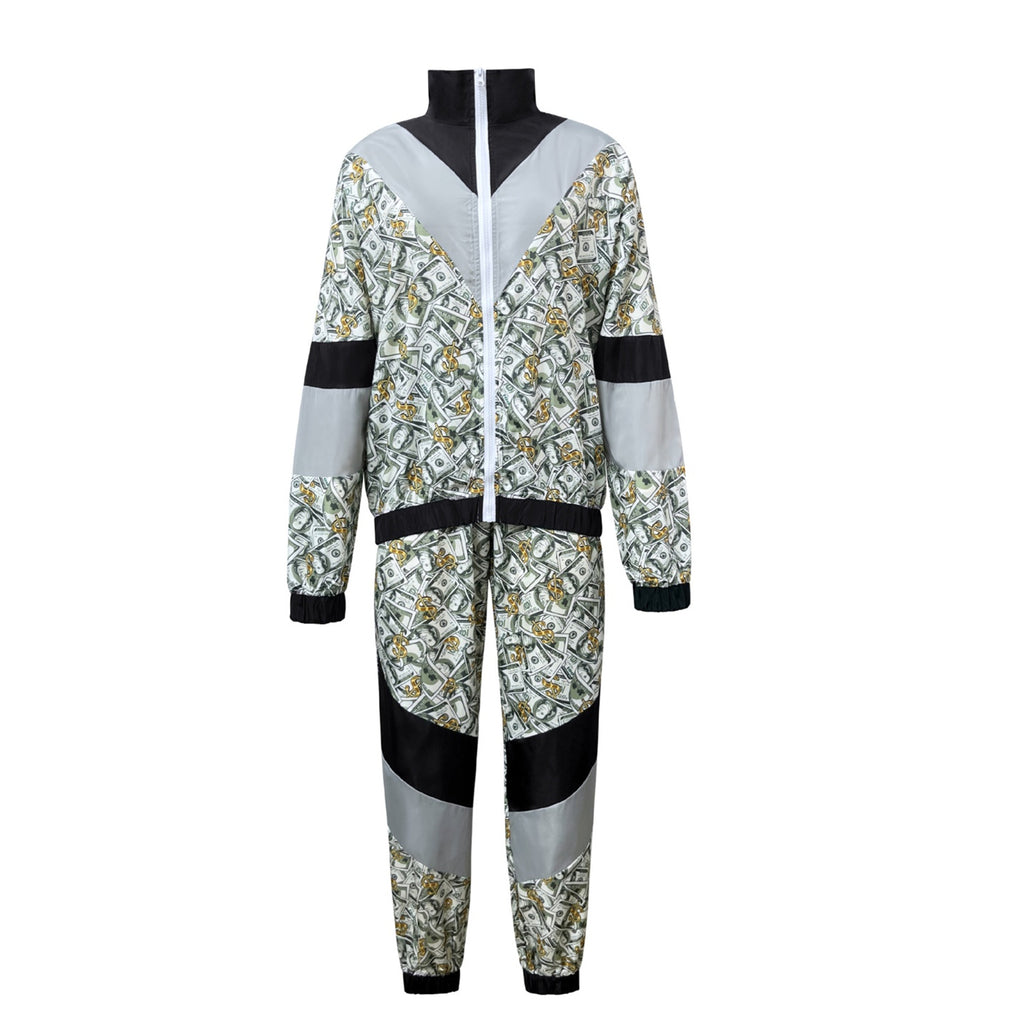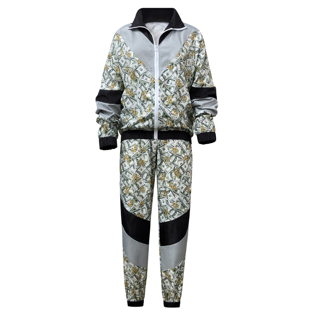 The AwwwCos Grey Floral Color Block 2 Piece 80s Retro Hip Hop Disco Tracksuit Jacket Pants is a vibrant and nostalgic choice for Halloween or any retro-themed party. This outfit features elegant floral patterns that exude a fun, retro 80s disco vibe. The pant elastic waistband ensures a comfortable and flexible fit, making it easy to move and dance in. full set costume is perfect for channeling the colorful and energetic spirit of the 80s. Whether you're hitting the dance floor or celebrating Halloween, this outfit is sure to turn heads and bring a touch of vintage flair to your look