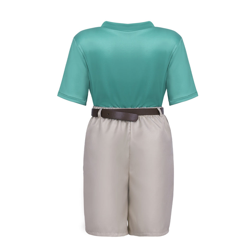 The AwwwCos Kids Boys Film Rise of the Non-Mammalians Nick Wilde Cosplay Costume is a cool and casual outfit inspired by Nick Wilde from Zootopia. The costume includes a green short-sleeve shirt with a round neckline, featuring letter prints on the front that reflect Nick's playful character. The gray shorts are paired with a black faux leather belt, adding a stylish, edgy touch. This versatile outfit is not only great for cosplay events but also suitable for everyday wear, allowing young fans to channel Nick Wilde's clever and laid-back style both on and off the screen.