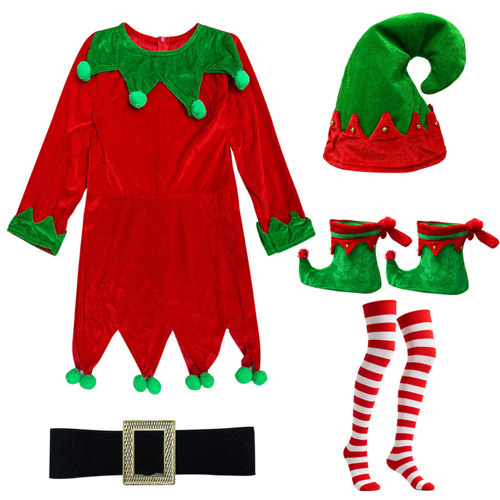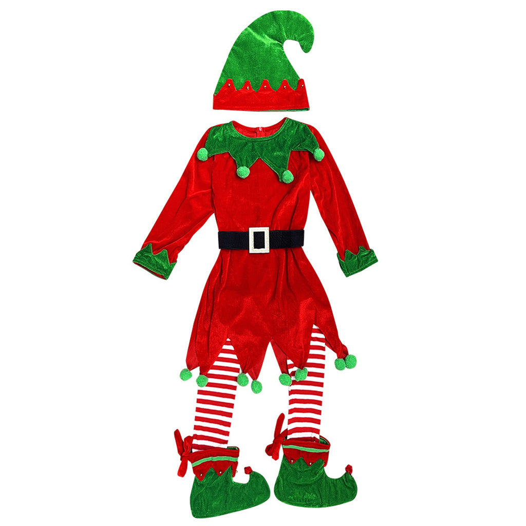 The AwwwCos Kids Boys Santa Claus Elf Cosplay Costume Christmas Velvet Dress Hat Shoes is a charming and festive outfit perfect for celebrating the holiday season. The set includes a long-sleeve red velvet dress with a classic Christmas elf design, complemented by a green pointed hat and a black belt. Red and white striped thigh-high socks and green shoes complete the look, making it a fun and playful costume for kids. This delightful ensemble is sure to bring holiday joy and excitement to any Christmas event or celebration.