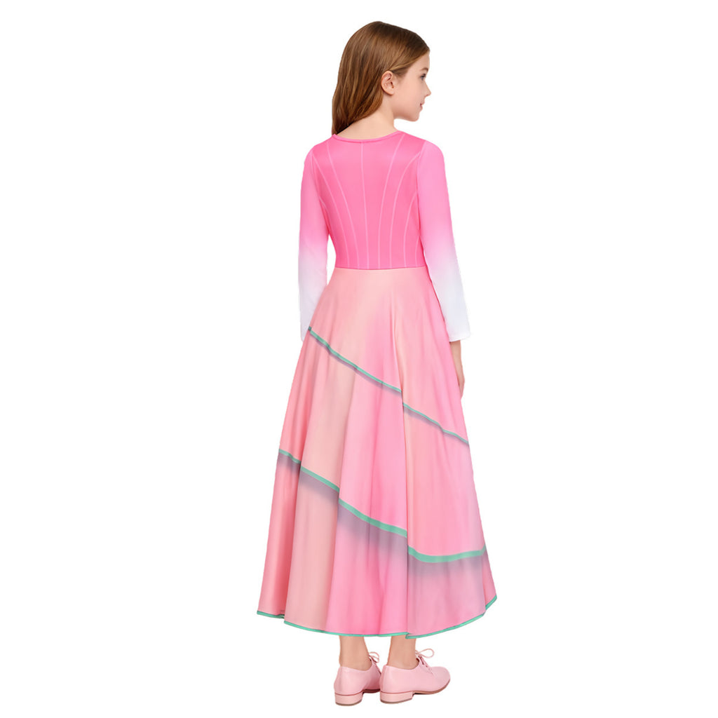 The AwwwCos Kids Girls Film Wicked Glinda Cosplay Costume Pink Long Sleeve Dress is a beautiful and enchanting outfit inspired by Glinda the Good Witch from Wicked. The dress features a round neckline and long sleeves with a soft pink-to-white gradient, adding a gentle, magical touch. The ankle-length skirt is adorned with green ruffled floral prints, perfectly capturing Glinda's iconic, graceful style. These details ensure an authentic portrayal of the character, making this costume an ideal choice for Wicked fans or anyone looking to embody the sweet and regal Glinda.