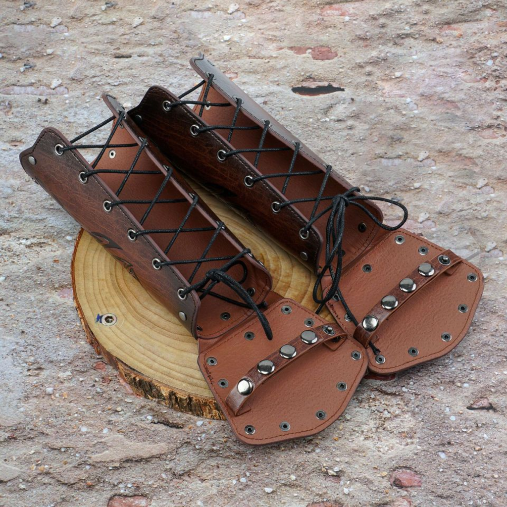 The AwwwCos Men Knight Viking Wolf Head Cosplay Accessory Faux Leather Arm Guards Cuff is a stylish and durable accessory perfect for completing your medieval pirate or Viking costume. Made from high-quality faux leather, these arm guards feature vintage metal buckle details and intricate, retro floral patterns for an authentic, rugged look. The laces come with eyelets and adjustable fittings to ensure a comfortable and secure wear. Available in two color options—black and brown—you can choose the one that best complements your outfit. These arm cuffs are ideal for adding a warrior-like edge to your Halloween or cosplay event.