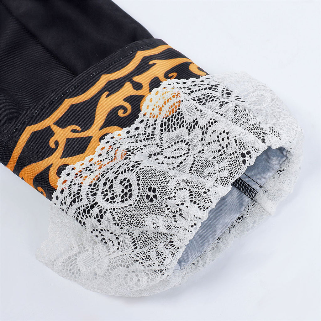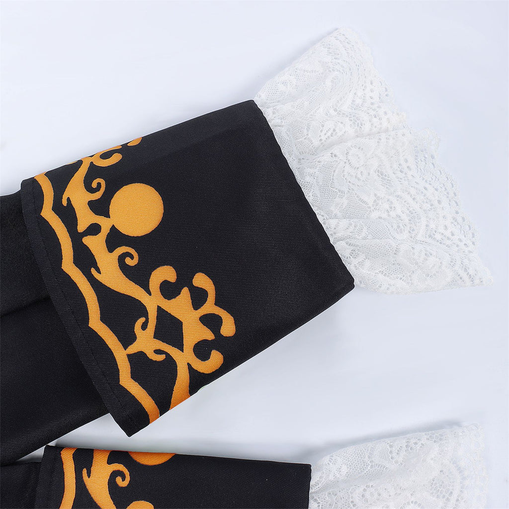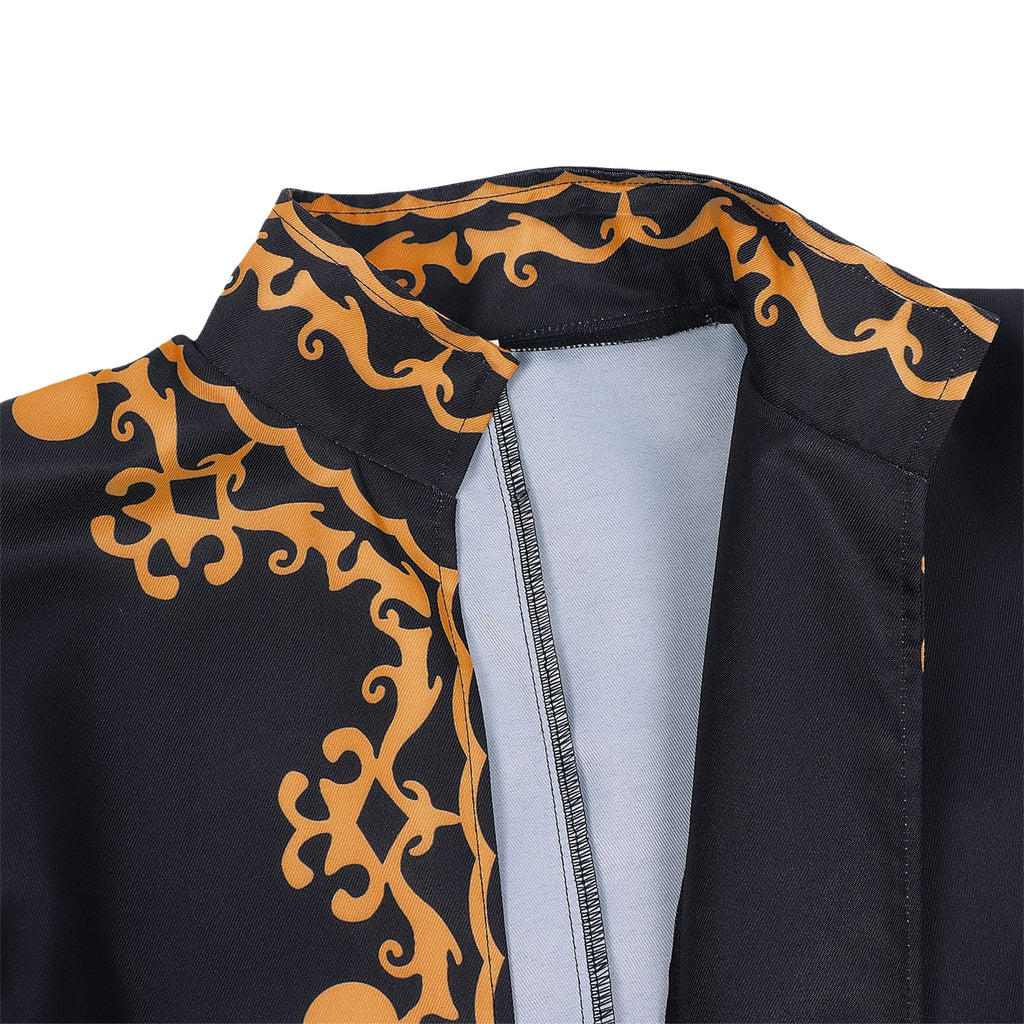 "Command attention this Halloween in AwwwCos's striking Gothic Steampunk Tailcoat - a lavish knee length coat featuring a regal high collar and lace sleeve trim, adorned with intricate royal court-inspired golden print flanking both sides of its button front. This majestic piece channels 19th-century aristocratic elegance with a dark fantasy twist, available in three opulent shades: sapphire blue, burgundy red, and timeless black. Perfect for embodying vampire nobles, steampunk villains, or haunted aristocrats, the coat's dramatic silhouette and exquisite detailing make it equally suited for Halloween festivities, gothic balls, or adding Victorian grandeur to your alternative wardrobe. Every stitch whispers tales of a mysterious bygone era."