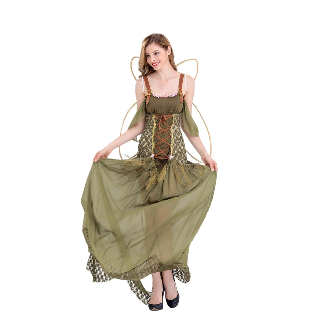 The AwwwCos Renaissance Elf Cosplay Costume Ren Faire Dress Wings Women Outer Garment is a beautifully crafted outfit that combines elegance with a touch of fantasy. The dress features delicate green straps and is adorned with intricate details like floral patterns, lace, and ruffled edges, giving it a charming Renaissance-inspired look. The costume is complemented by a headpiece made of pink flowers and butterfly-shaped wings, adding a whimsical, ethereal touch. Perfect for Renaissance fairs, cosplay events, or any festive occasion, this costume brings a magical, nature-inspired vibe to life.
