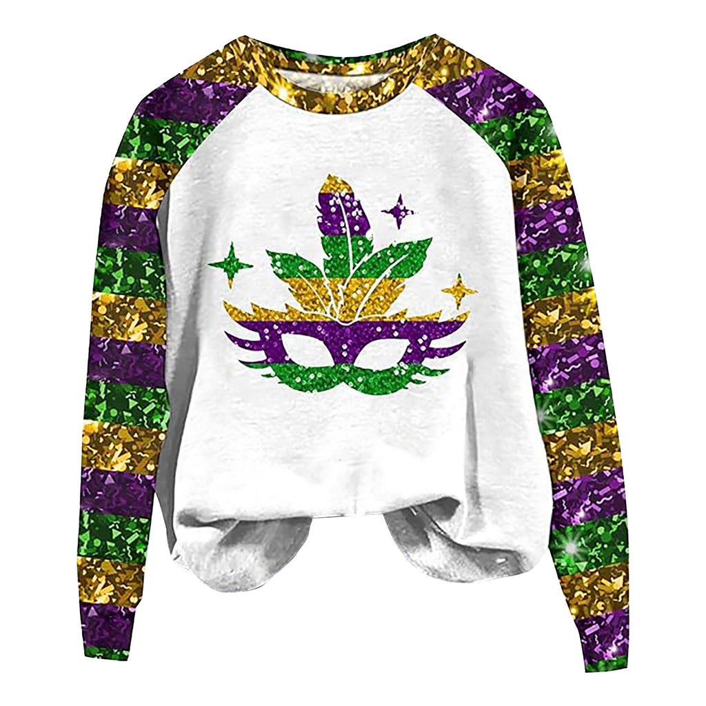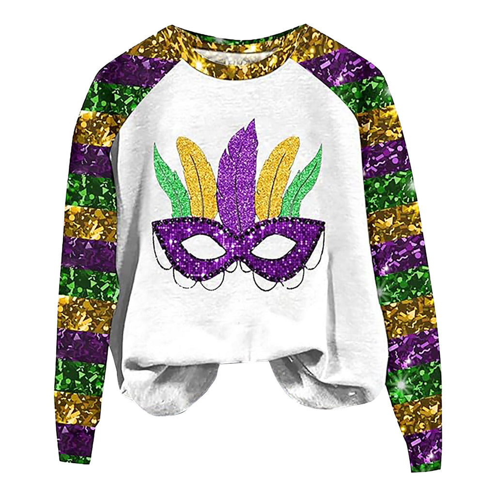 AwwwCos women's sportswear round neck feather print pullover sweater carnival sweater is a festive and comfortable choice for Halloween celebrations. This sports shirt features a unique print with Halloween elements such as feathers, masks, and jewelry, and the long sleeves are covered in sequins. Add a playful and terrifying touch to your clothing. It has 13 different styles to choose from, offering various designs to suit your Halloween appearance. The long sleeved design ensures comfort and warmth, making it perfect for staying comfortable during holidays while embracing the spirit of carnival and Halloween.