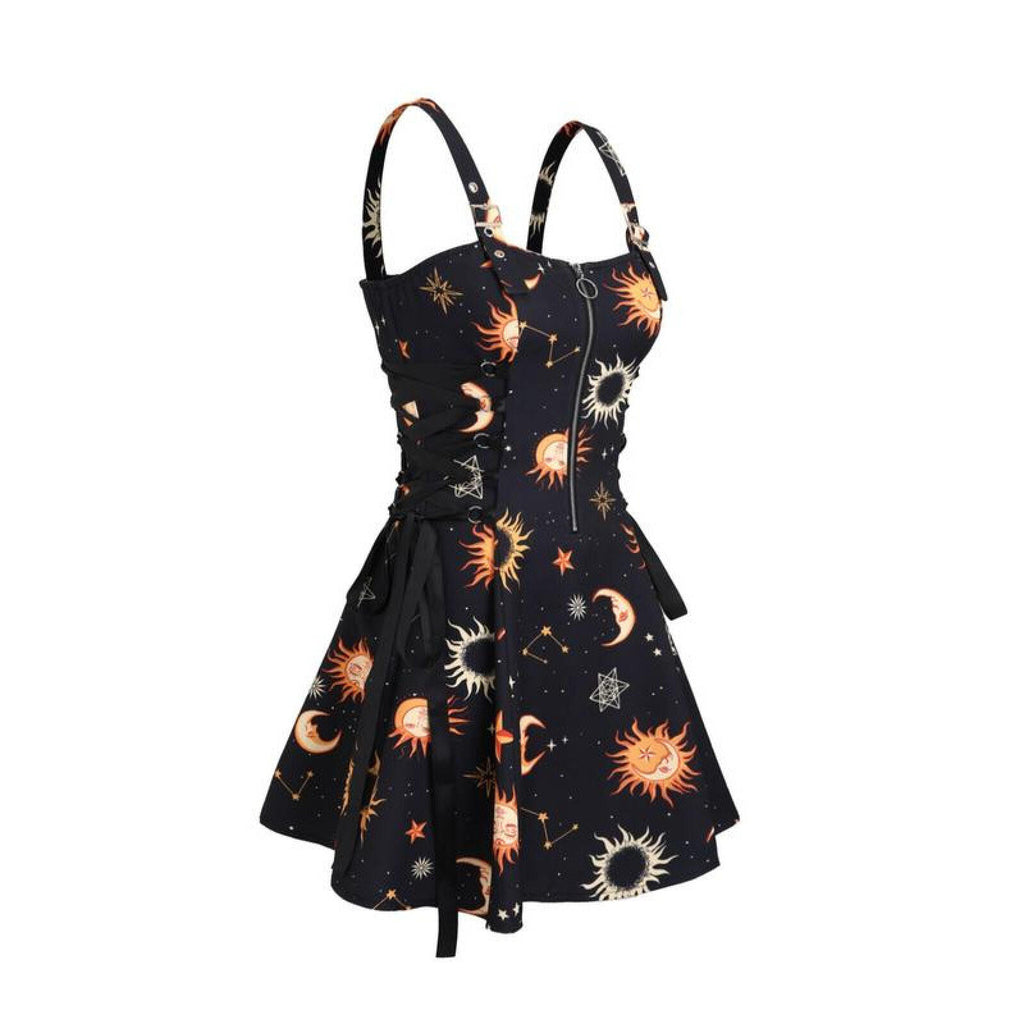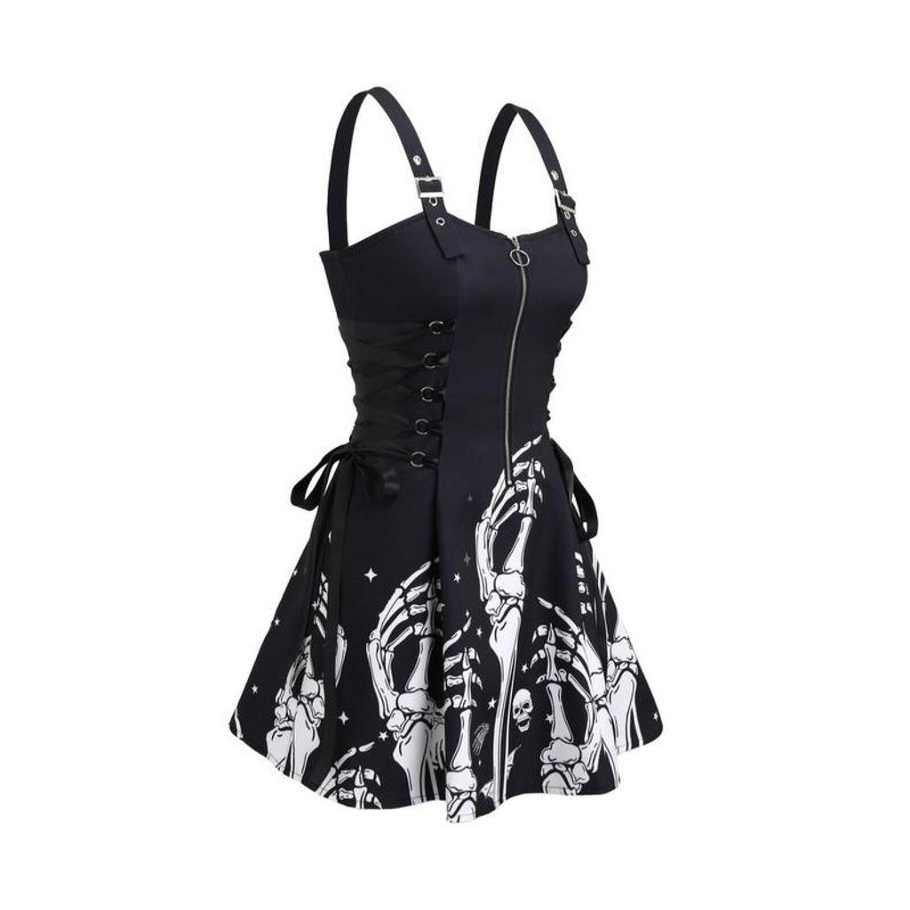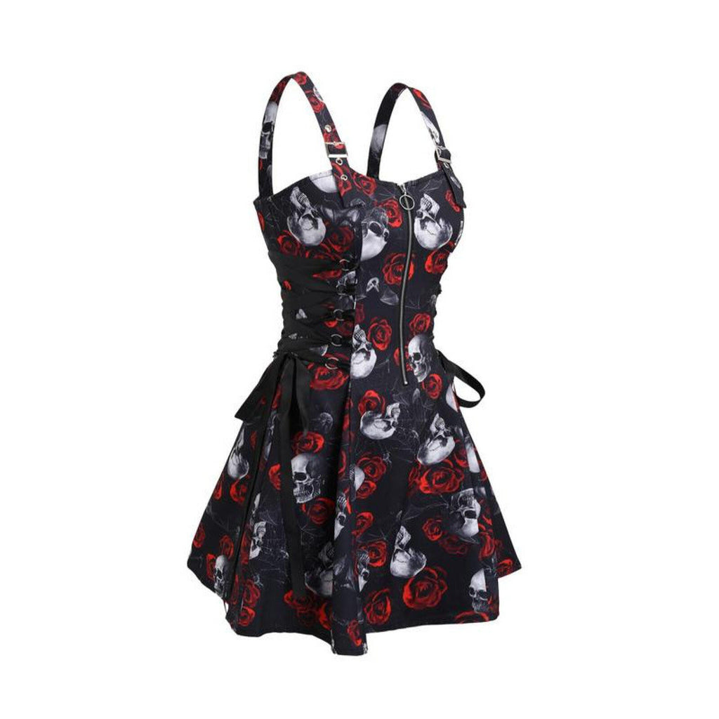 The AwwwCos Women Gothic Vampire Cosplay Lace Up Mini Spaghetti Strap Vintage Print Dress is a stunning and versatile outfit perfect for Halloween or gothic-themed events. This A-line, knee-length dress features a form-fitting design with a front zipper for easy wear. The lace-up detailing on the sides of the waist allows for adjustable comfort, while the metal buckles on the spaghetti straps offer length customization. Available in 15 different styles, the dress comes in both printed and solid colors, giving you plenty of options to match your unique gothic or vampire look.