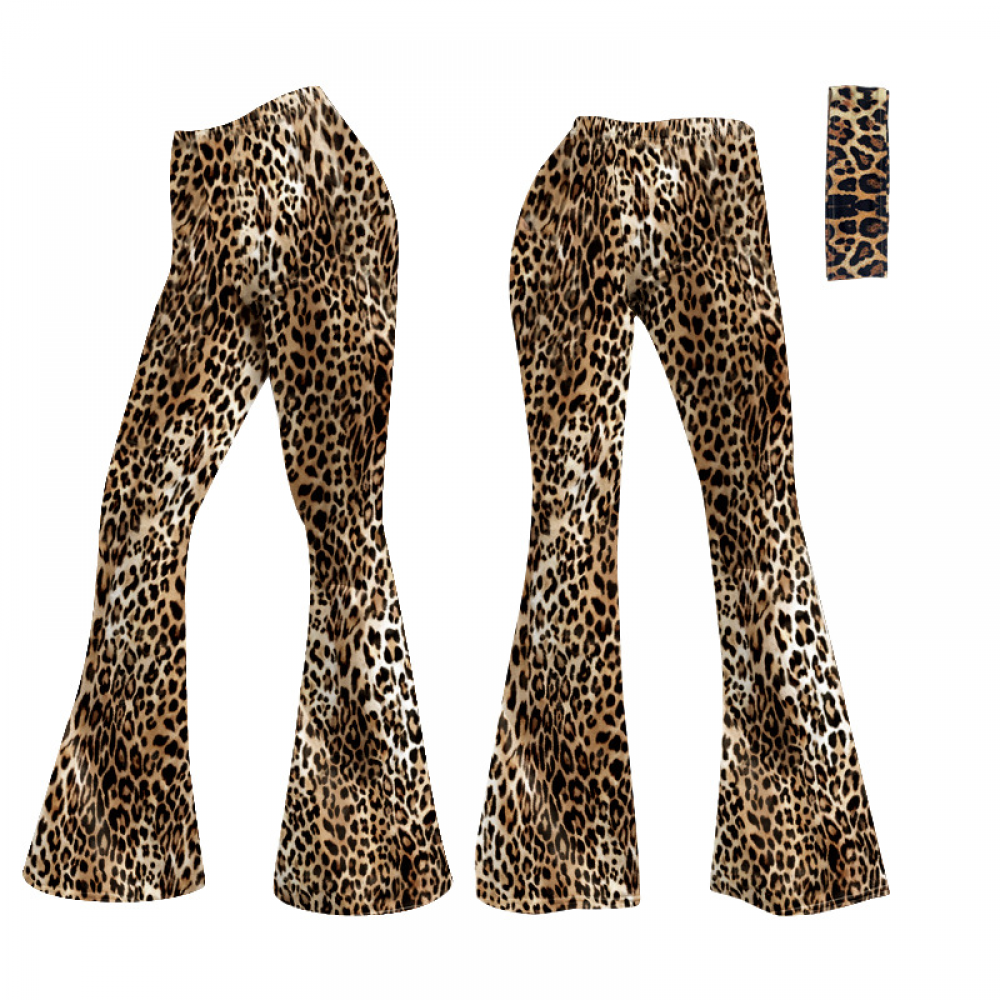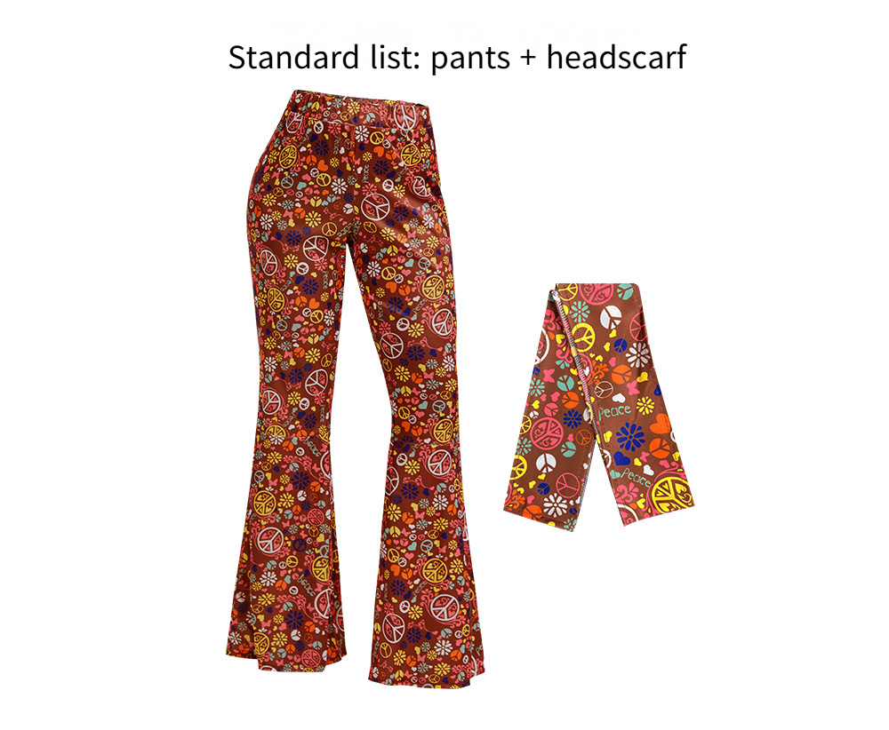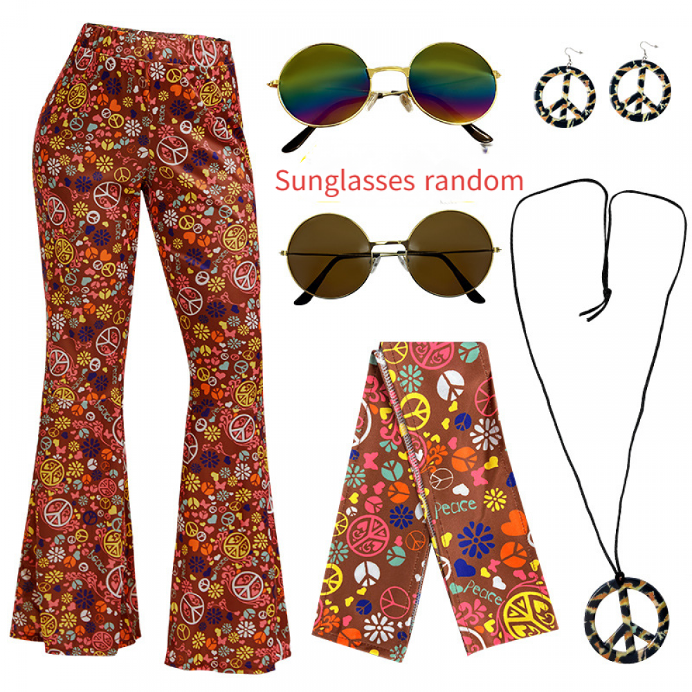 The AwwwCos Women Hippie Fashion Wide Leg Flared Pants Printed Trousers Turban set is a perfect retro-inspired outfit for Halloween or any groovy event. The wide-leg flared pants come in three different vibrant prints, adding a fun and colorful touch to your look. The set also includes a matching turban for a complete hippie vibe. In addition, the five-piece set features stylish accessories such as a necklace, earrings, and sunglasses, all designed to elevate your costume. This outfit is ideal for anyone wanting to embrace the free-spirited fashion of the '60s and '70s in a playful and eye-catching way
