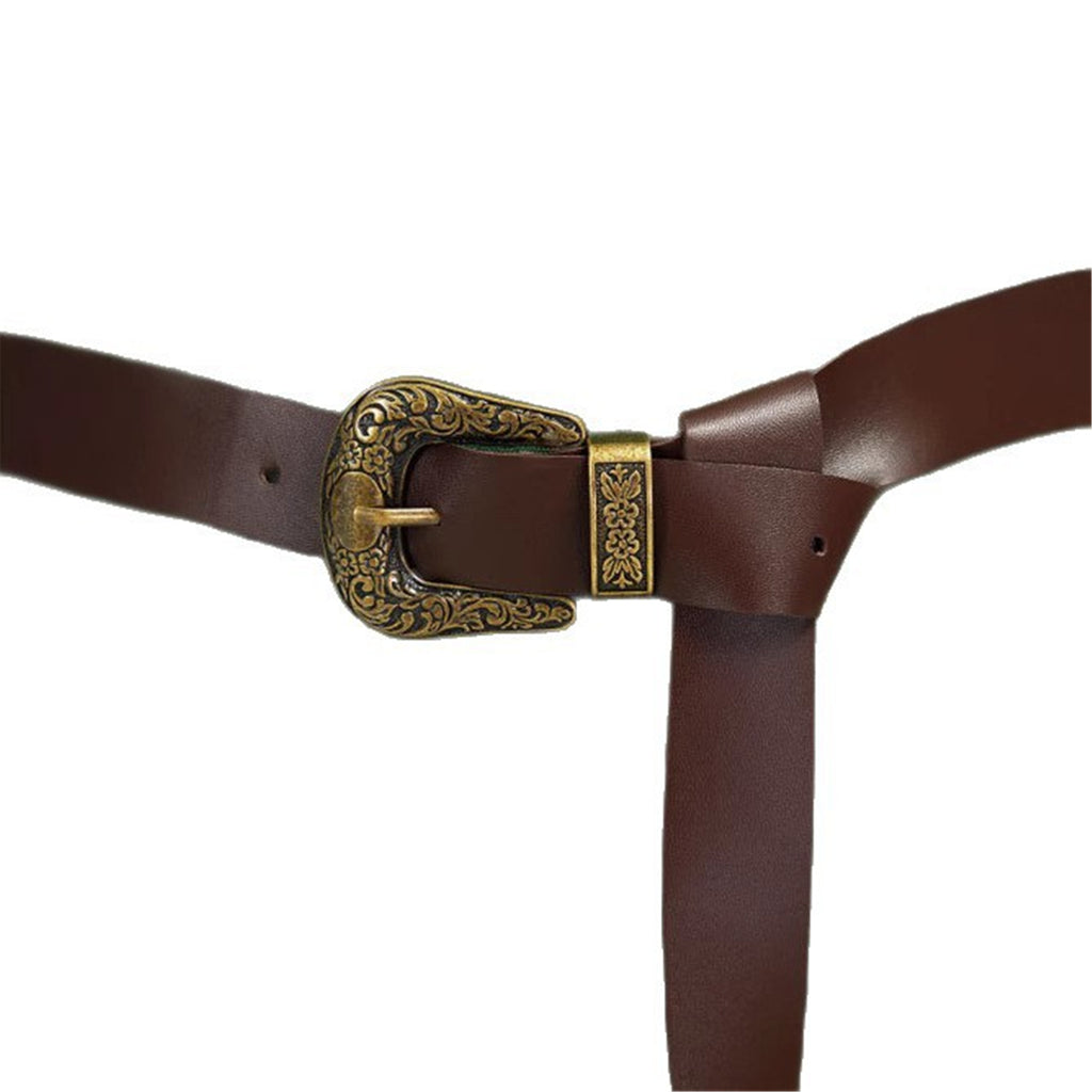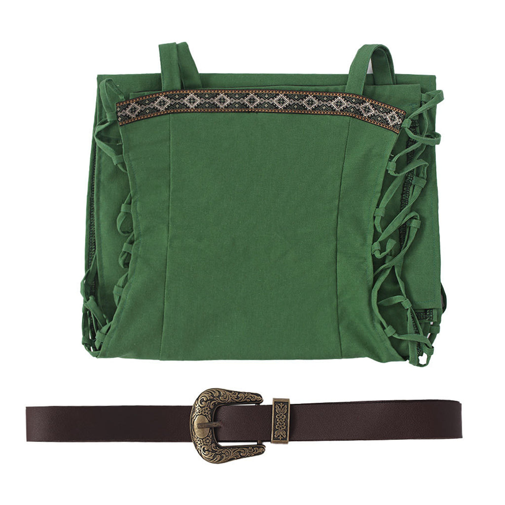 The AwwwCos Women Medieval Viking Cosplay Costume features a captivating and rugged design perfect for Halloween or medieval-themed events. The green spaghetti strap dress is form-fitting, with adjustable side lacing that allows for a custom fit. The brown belt, adorned with a metal buckle, adds an authentic medieval touch, completing the ensemble with a sense of historical charm. This costume blends both elegance and strength, making it ideal for those wanting to channel the spirit of the Viking era or medieval times.