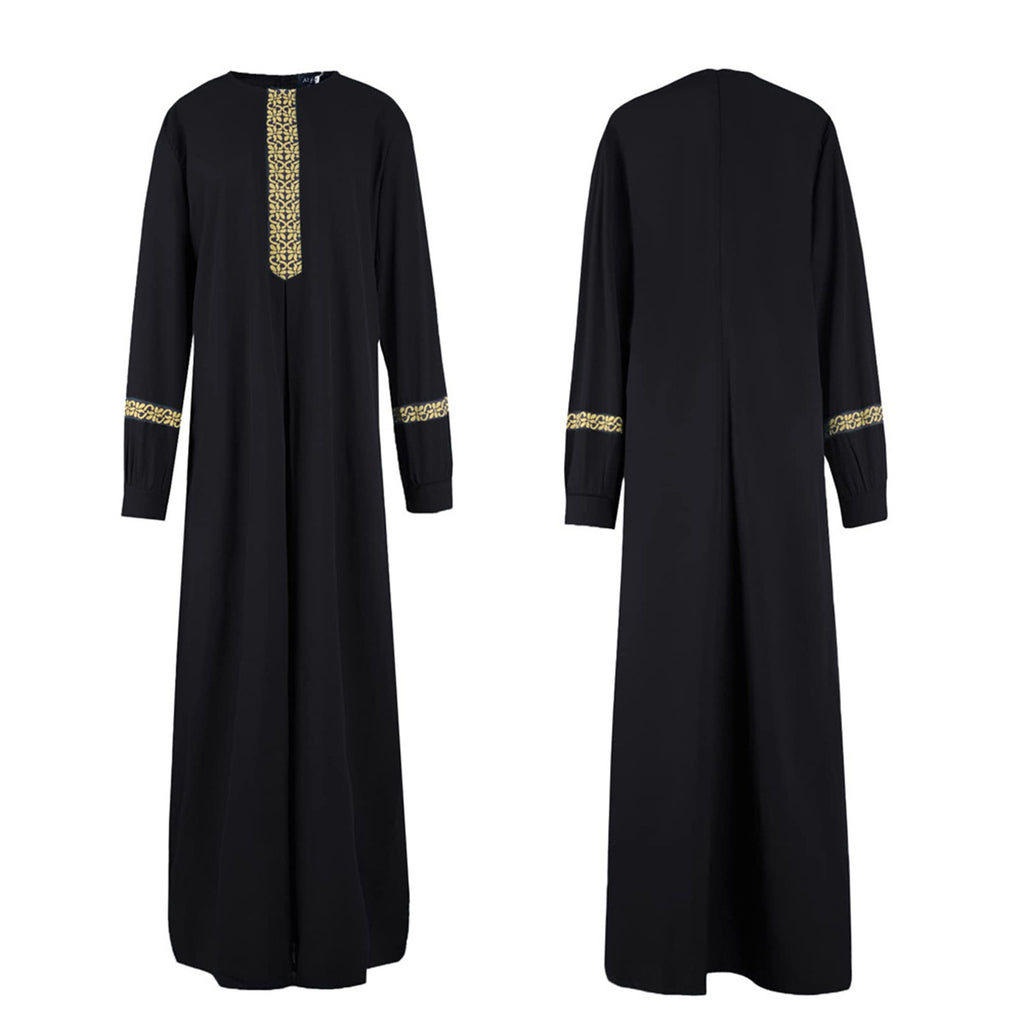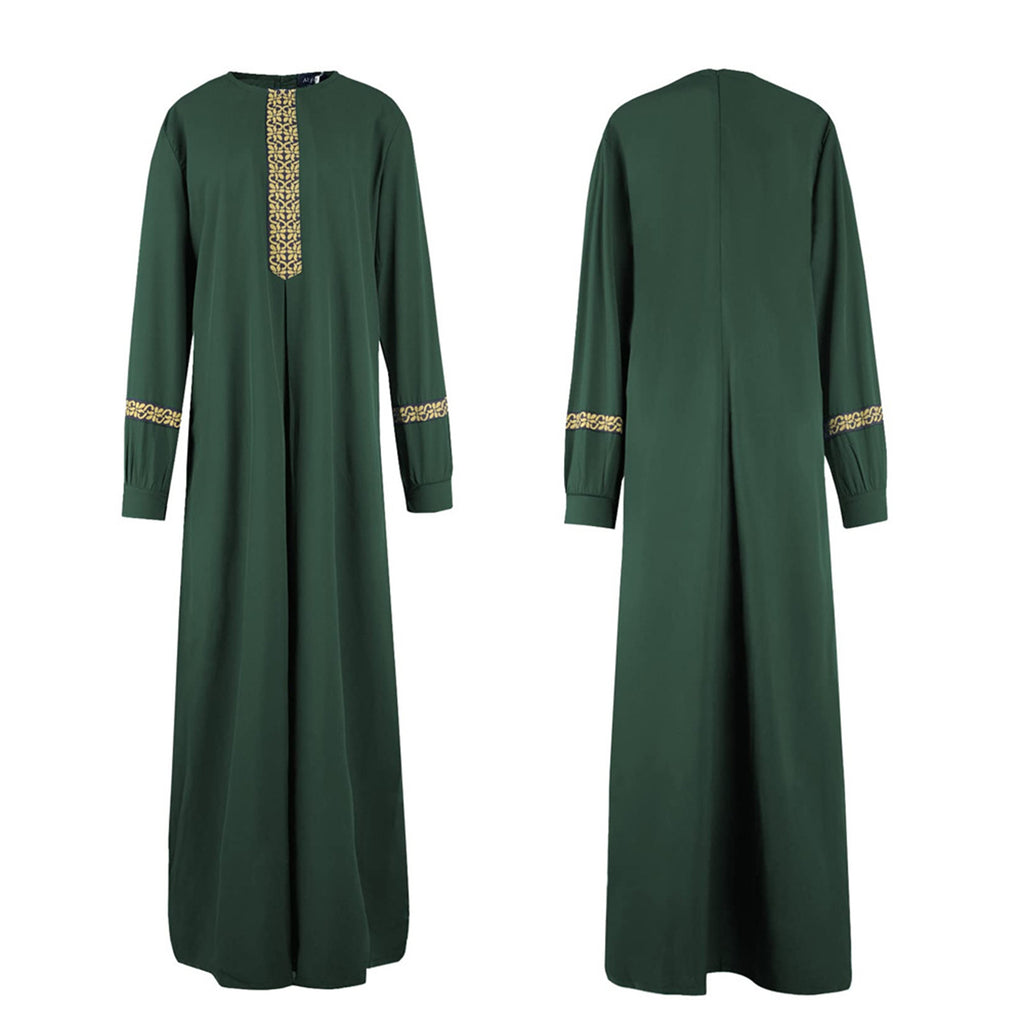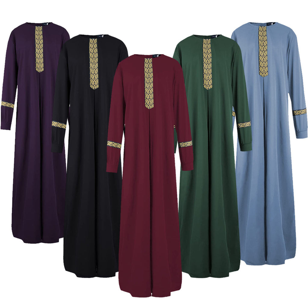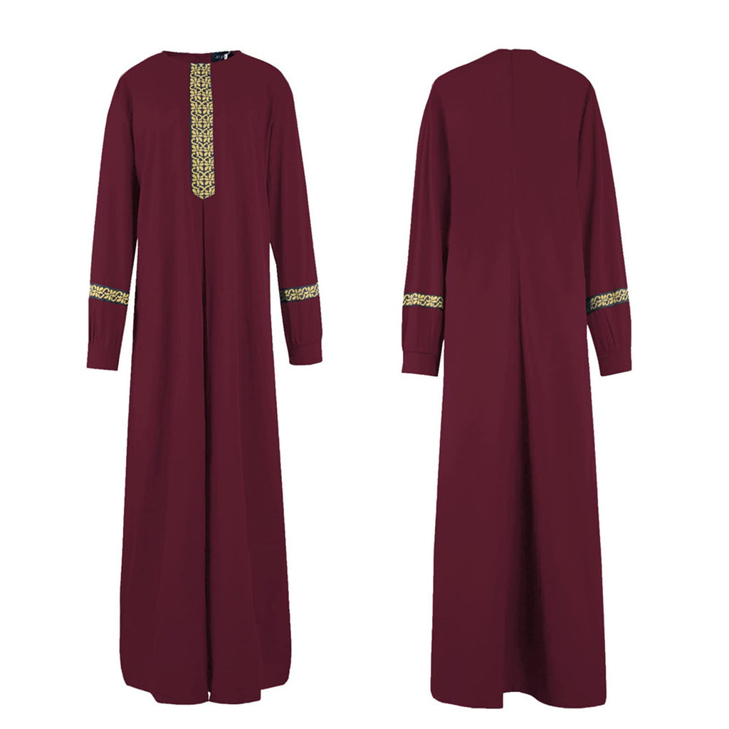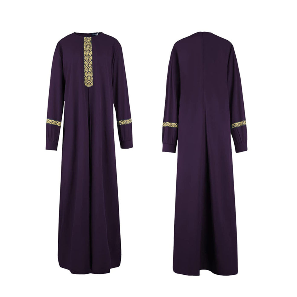 The AwwwCos Women Muslim Dress Zipper Islamic Robe is a comfortable, full-length dress perfect for a variety of occasions, including Halloween events. This long-sleeve, ankle-length robe is crafted from soft fabric, ensuring a relaxed fit. The dress features embroidered lace details on the neckline and sleeve cuffs, adding a touch of elegance to its simple design. Available in five colors—black, purple, red, blue, and green—it offers versatile options for different styles. This dress is not only ideal for cosplay or Halloween celebrations but also suitable for daily wear, combining modesty with contemporary charm.