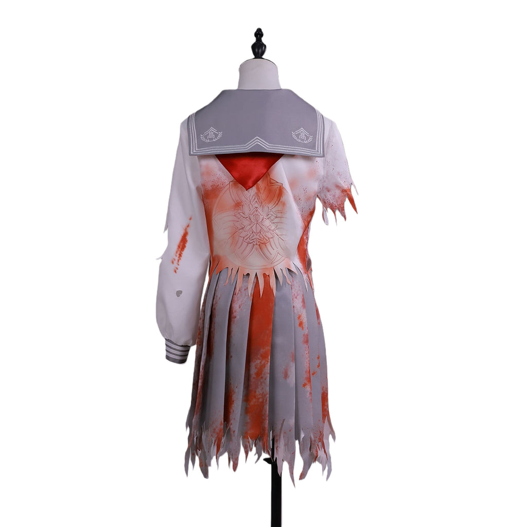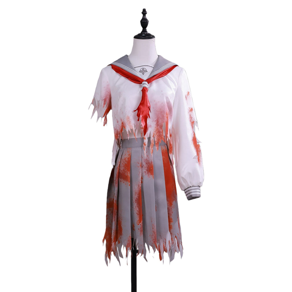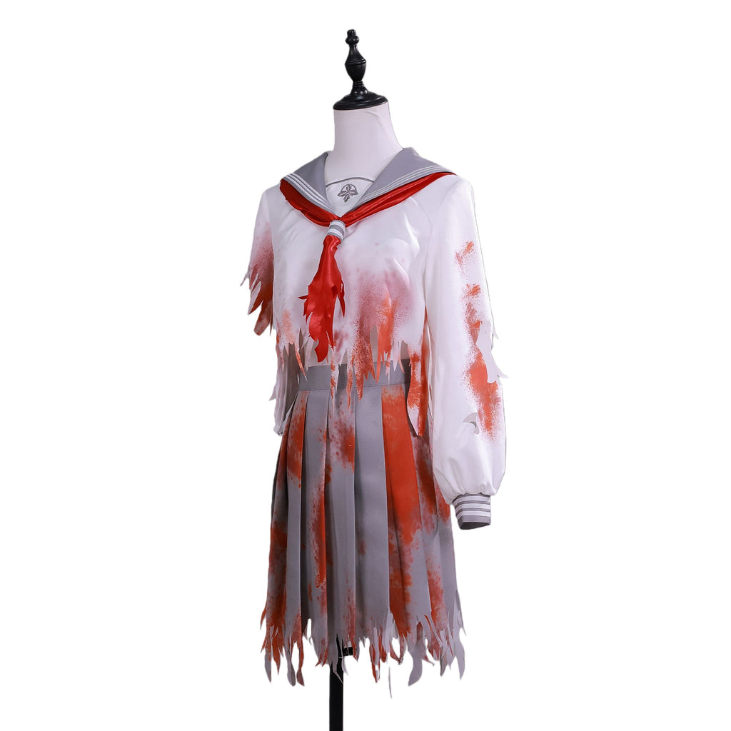 The AwwwCos Game Silent Hill Shimizu Hinako Cosplay Costume Bloodstained Sailor Suit is a haunting and eerie outfit inspired by the Silent Hill series, perfect for creating a chilling Halloween look. The sailor suit is made from printed fabric stained with blood, there are embroidered logo on collar ,adding to its unsettling atmosphere. The right sleeve appears violently torn, while the skirt is uneven and looks as though it's been ripped, enhancing the distressed and horror-filled aesthetic. The costume is completed with a red bow tie, giving it an extra touch of eerie detail. Ideal for fans of Silent Hill or anyone looking to embrace a terrifying, blood-soaked look for Halloween or cosplay events.